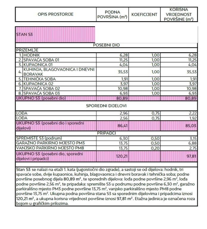 Pripada mu spremište površine 6,30 m2, te jedno vanjsko i drugo garažno parkirno mjesto. Ukupno etažna jedinica stana oznake S3 će imati 97,81 m2.