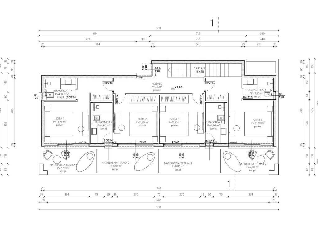 The upper floor includes four bedrooms and four bathrooms, making this villa an excellent choice for larger families as well as for tourist rental. A special advantage is underfloor heating in the bathrooms and bedrooms, providing added comfort throughout the year.