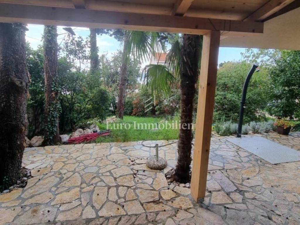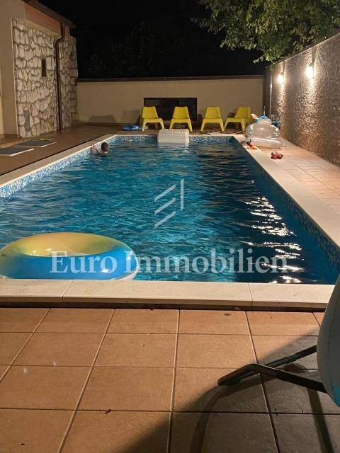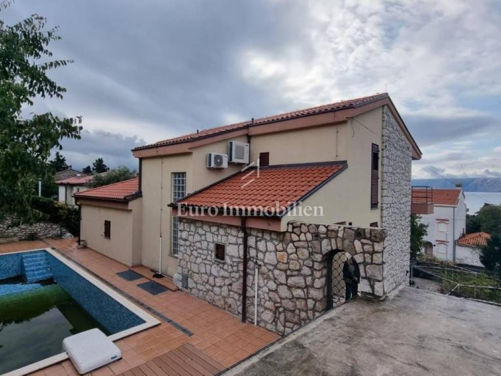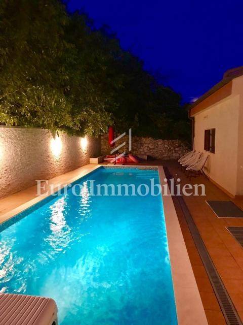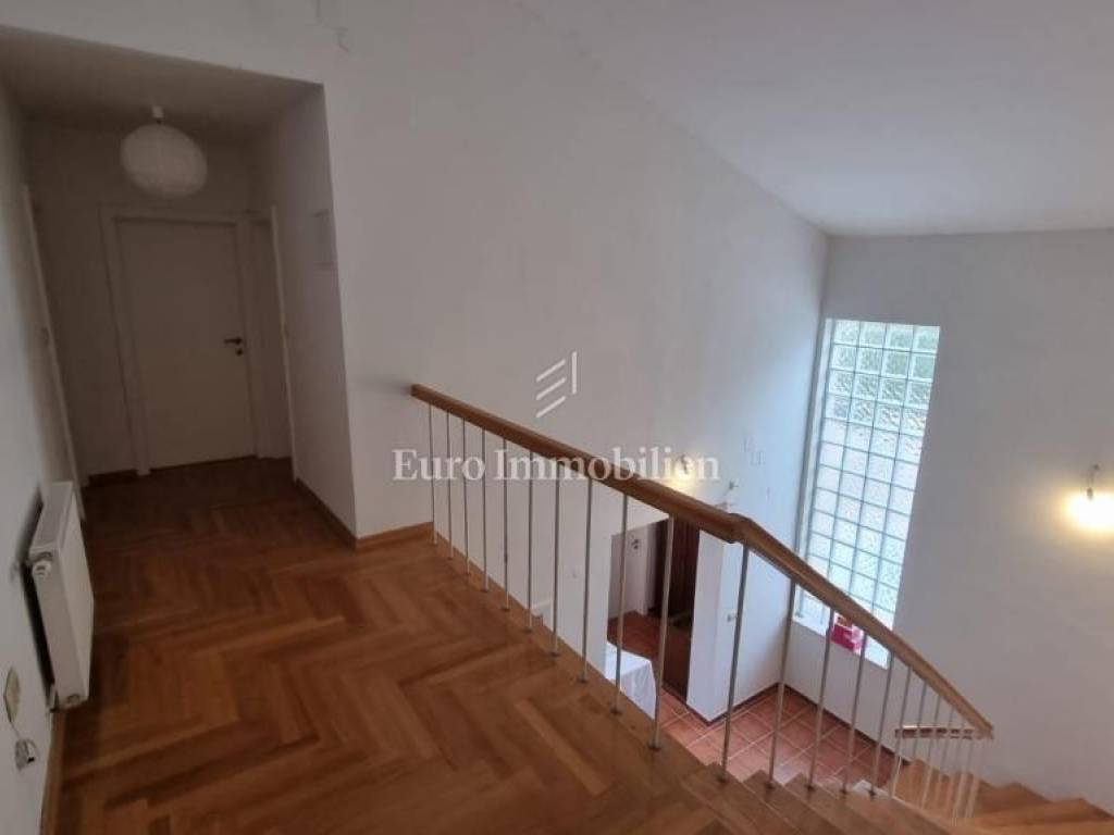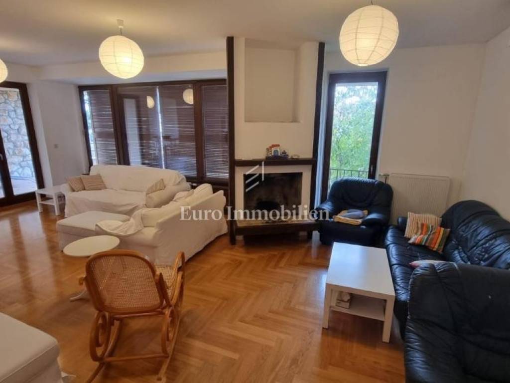 This property is located within a landscaped fenced yard with a wide driveway. It has a large garage that can accommodate a larger boat. At the front of the property, there is a large green garden that hides the house from view and provides complete privacy, while at the back is a large swimming pool with a sun deck. On the ground floor of the house, there are two apartments, each with a separate entrance, but they are connected to the rest of the house by an internal staircase. The first and second floors are connected as a two-story apartment. On the lower floor, there is an extremely large living area with a kitchen, a dining room, terraces with areas for socializing, and a lounge area. Upstairs there are four bedrooms and two bathrooms with balconies offering a beautiful view of the sea. High-quality construction materials, along with the Mediterranean style, make this house special.
