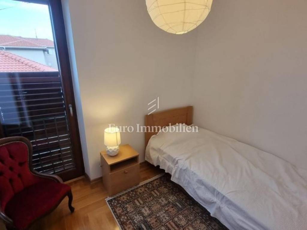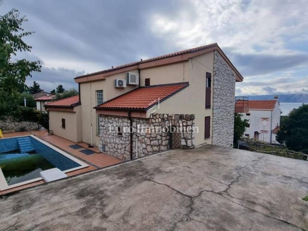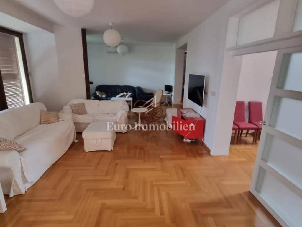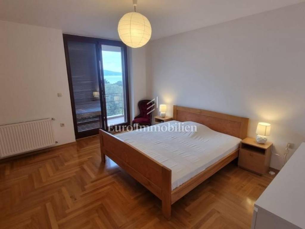This property is located within a landscaped fenced yard with a wide driveway. It has a large garage that can accommodate a larger boat. At the front of the property, there is a large green garden that hides the house from view and provides complete privacy, while at the back is a large swimming pool with a sun deck. On the ground floor of the house, there are two apartments, each with a separate entrance, but they are connected to the rest of the house by an internal staircase. The first and second floors are connected as a two-story apartment. On the lower floor, there is an extremely large living area with a kitchen, a dining room, terraces with areas for socializing, and a lounge area. Upstairs there are four bedrooms and two bathrooms with balconies offering a beautiful view of the sea. High-quality construction materials, along with the Mediterranean style, make this house special.