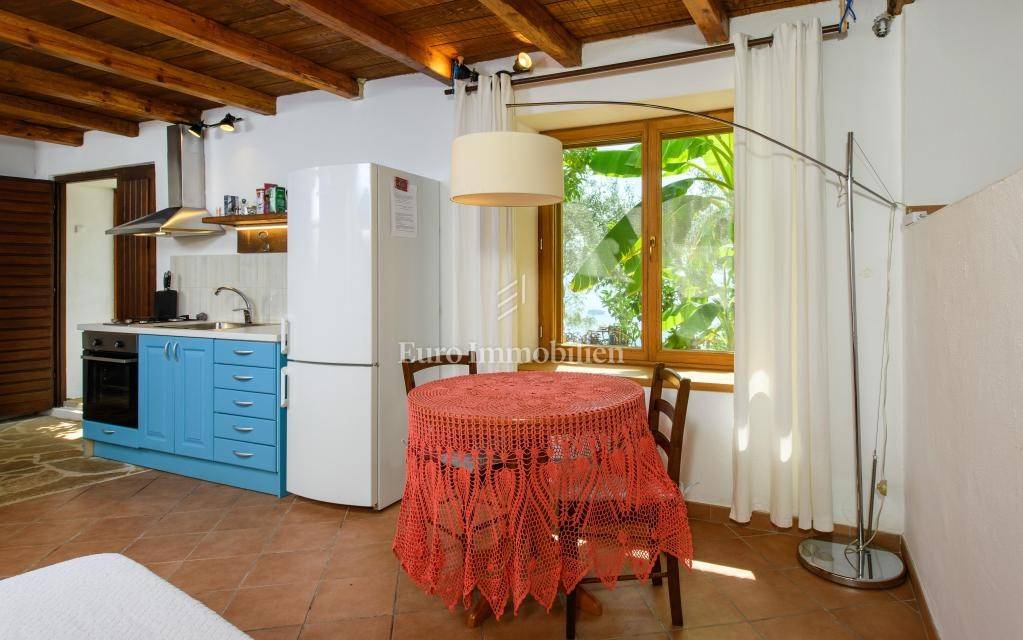 Apartment 4 is on one floor and consists of a kitchen, dining room and bedroom in one space, a separate bathroom and a terrace with a landscaped Mediterranean garden. The total floor plan area is 32.90 m2. The house and each apartment have their own separate entrance, through the terrace. Heating and cooling is via air conditioning, and only the house has a wood stove. It does not have its own parking lot, but uses a public parking lot nearby. The orientation of the property is towards the south with a fantastic view of the sea and the island of Hvar.