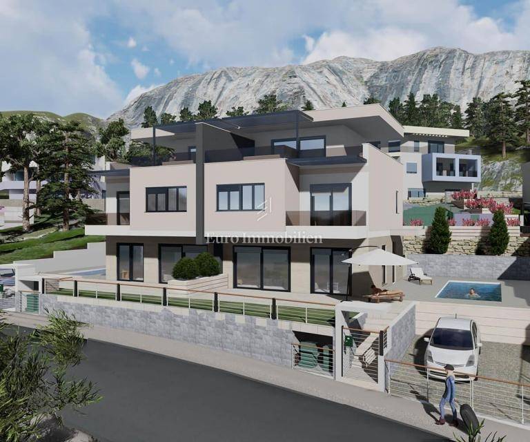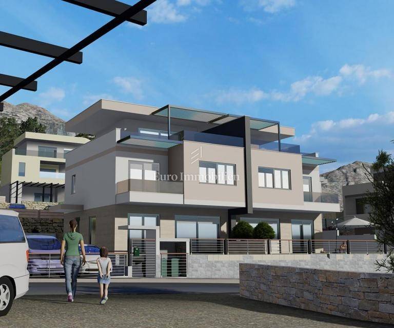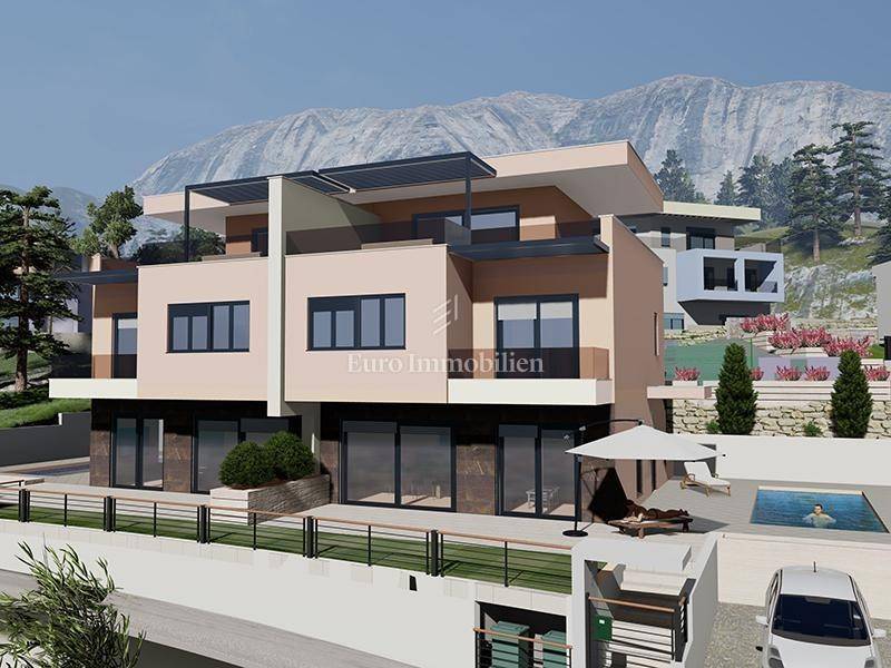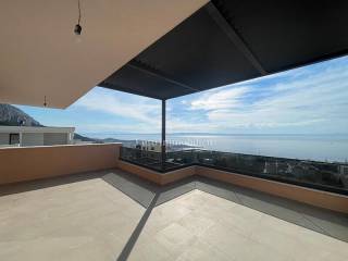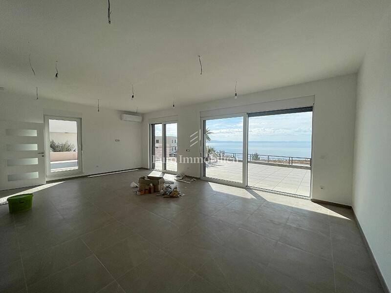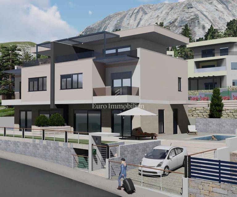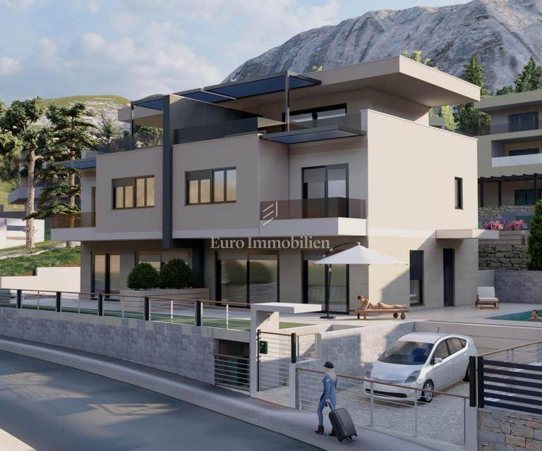 A new modern villa for sale with a swimming pool and a beautiful view of the sea in Veliko Brdo above Makarska.