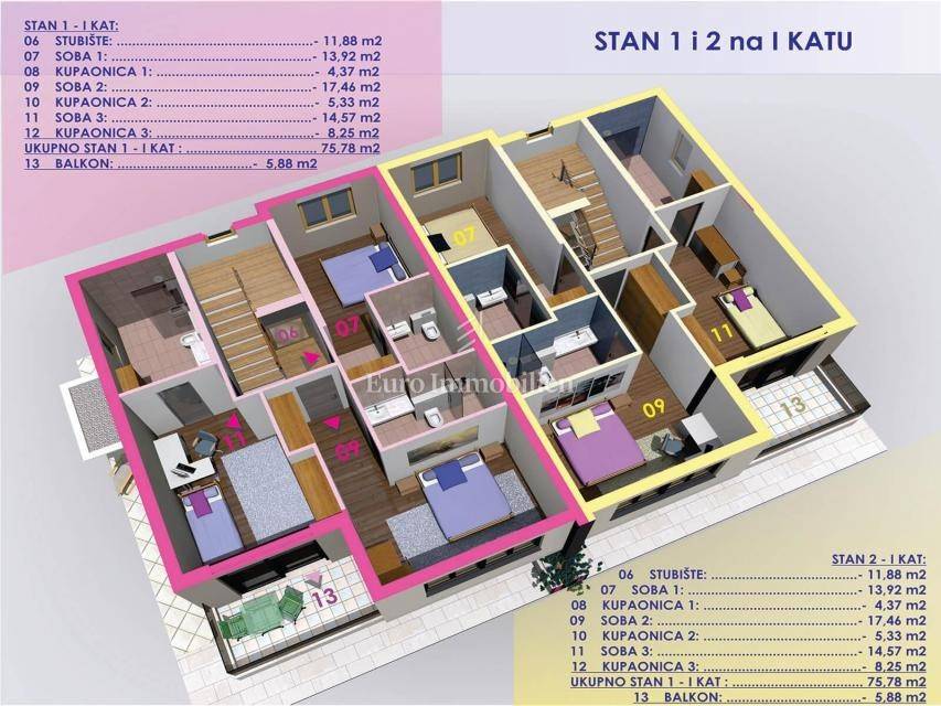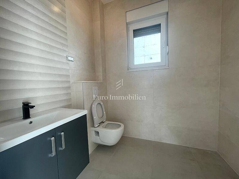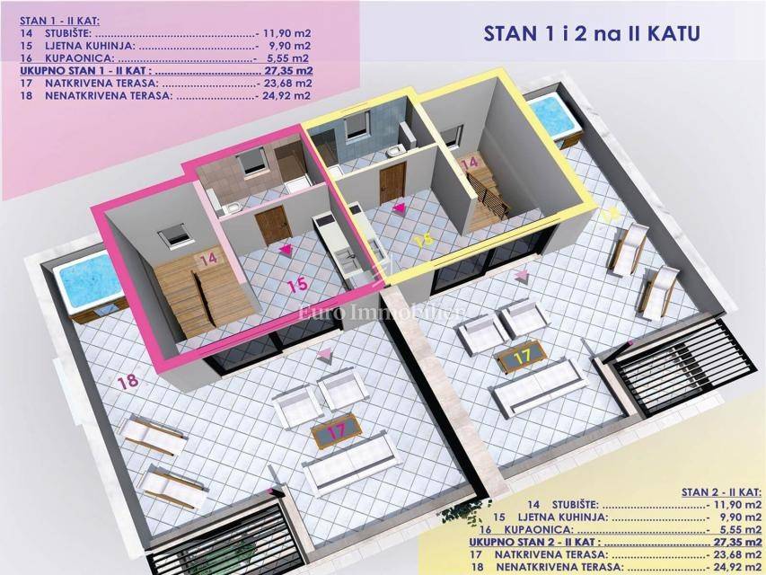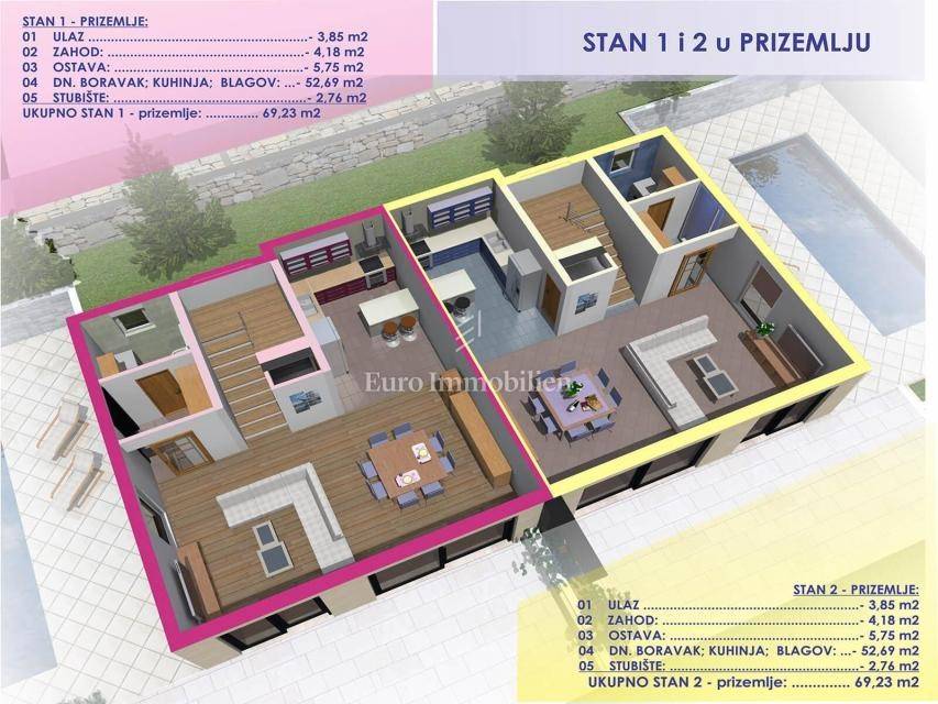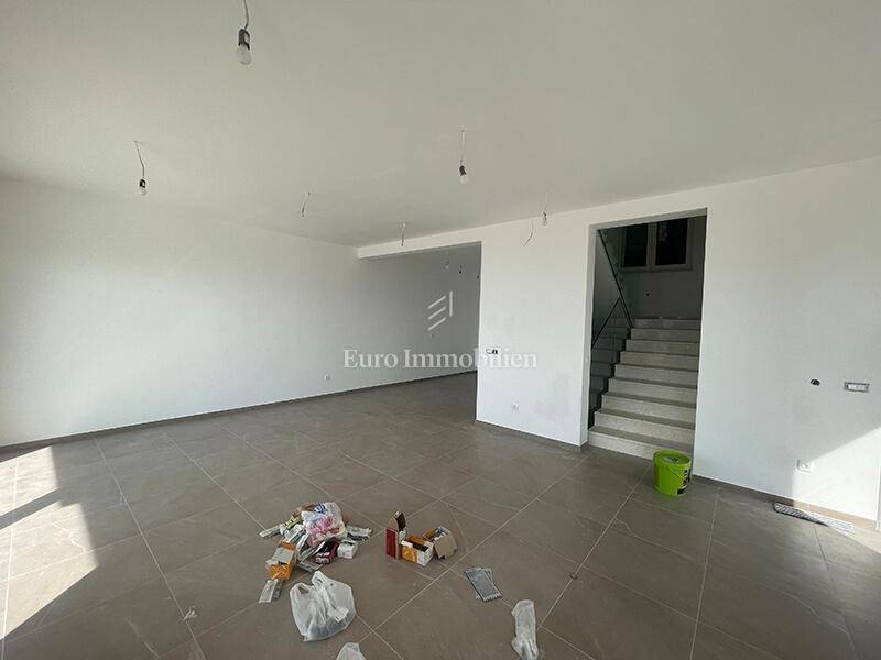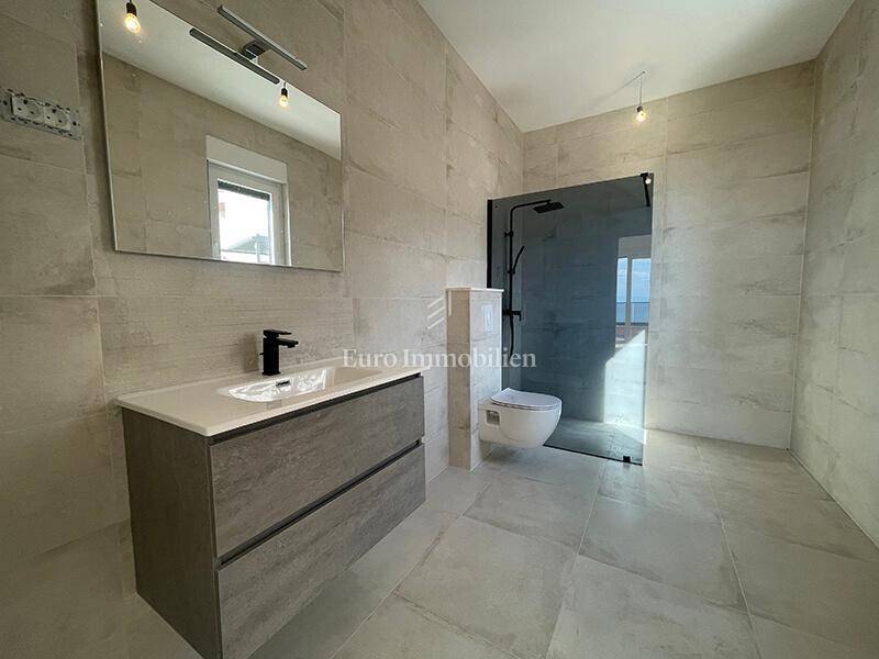 This villa with an area of 226 m2 extends over the ground floor and two floors, and was built as a semi-detached villa on a plot of land of 620 m2. On the ground floor there is a living room with a kitchen, a toilet and a storage room. On the first floor there are three bedrooms with three en-suite bathrooms and a balcony. The second floor is designed as a semi-open floor with a summer kitchen, a bathroom, a covered terrace of 23.68 m2 and an uncovered terrace of 24.90 m2 where a jacuzzi tub can be installed. The terrace offers a beautiful view of the sea and the islands. The villa has an outdoor pool of 29 m2.
