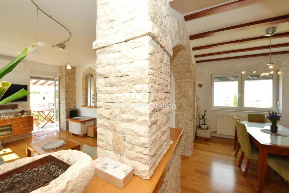 APPARTAMENTO in vendita con vista mare in un edificio residenziale con ascensore in Relja a Zara. L'immobile è situato al quarto piano e si sviluppa su due livelli.