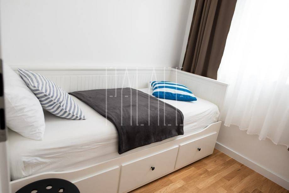 On the first floor, there is a 107m2 apartment, consisting of an entrance hall, three bedrooms, two bathrooms, a kitchen with a dining area, a living room with access to a spacious loggia offering a beautiful panoramic view of the sea and islands. The apartment is completely new, furnished, kitchen, sanitary ware, tiles, etc., and is equipped with electric underfloor heating.