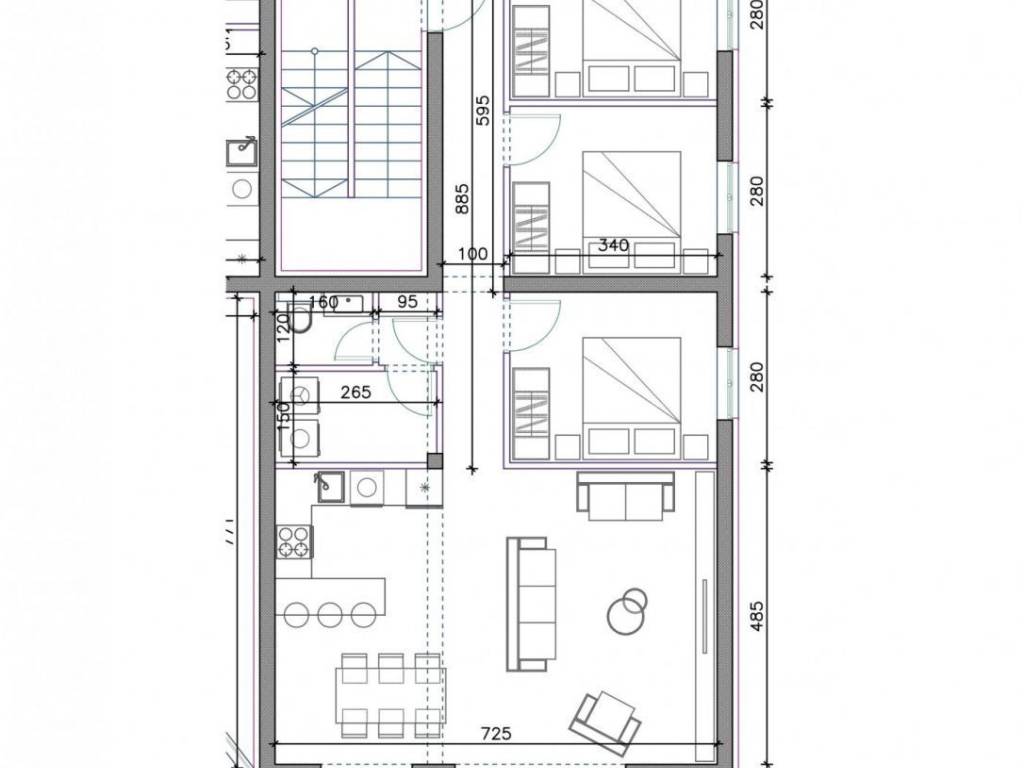 ENTRANCE AREA: 1.14 m2 CORRIDOR: 8.85 m2 ROOM 1: 9.52 m2 ROOM 2: 9.52 m2 ROOM 3: 9.52 m2 KUH./BLAG./DN.B. : 35.16 m2 BATHROOM 1: 5.72 m2 BATHROOM 2: 3.96 m2 WC: 1.92 m2 LAUNDRY: 3.95 m2 BALCONY: 10.69 m2 ROOF TERRACE: 31.73 m2
