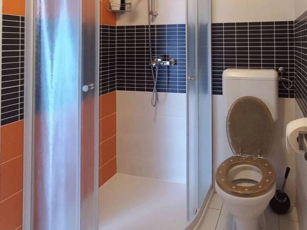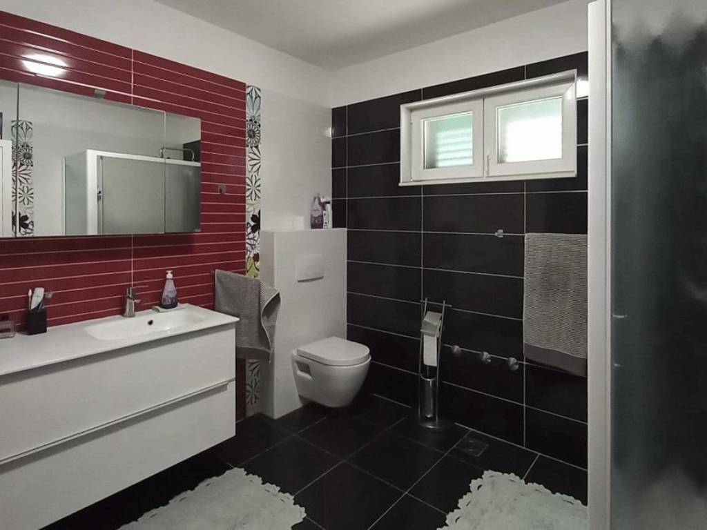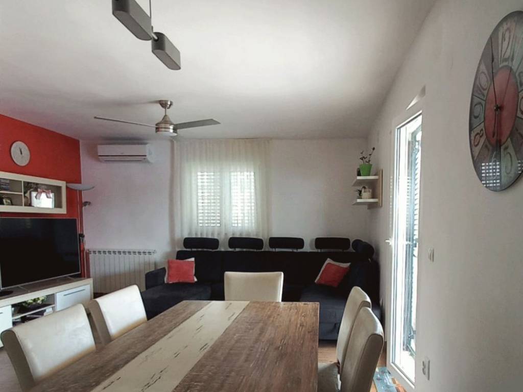The apartment with an area of 115 m2 has three bedrooms, two bathrooms, a terrace of an additional 43 m2, and a utility room with central wood heating (Buderus manufacturer), central electric heating, and a solar panel heated boiler.
