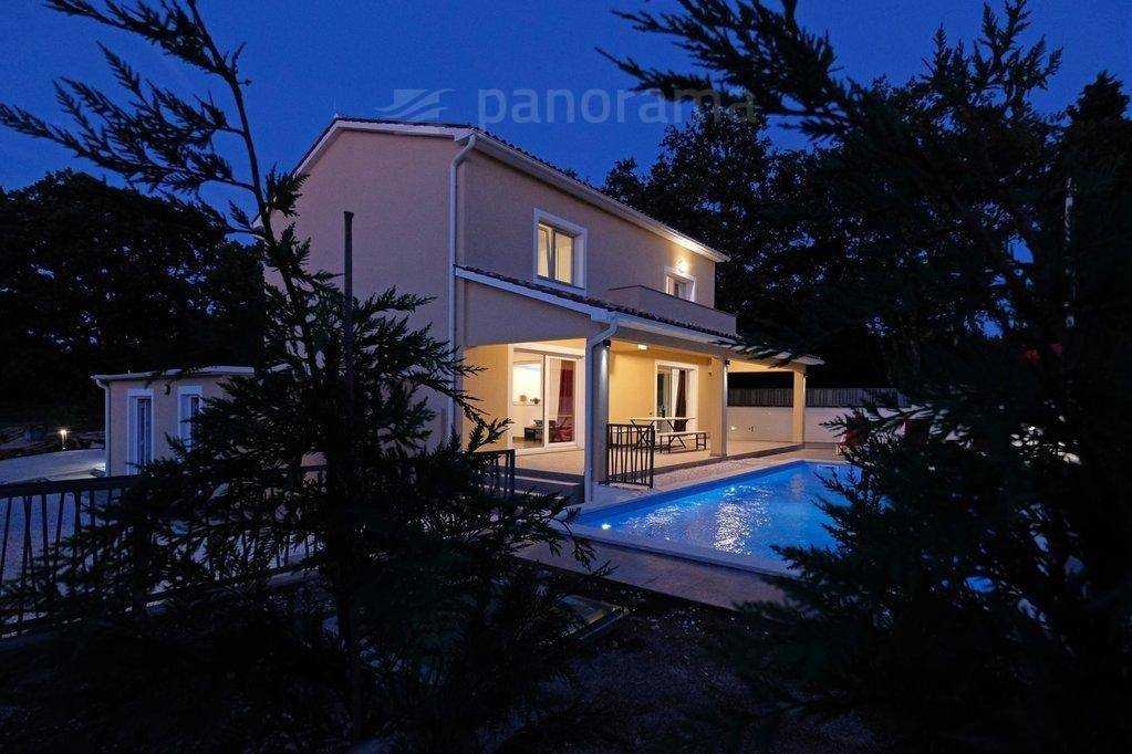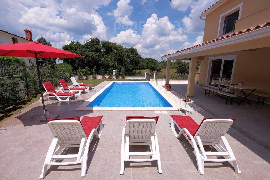 In the continuation of the covered terrace there is a sun deck with a pool of 36 m2. The plot is fenced, partly green and irrigated, partly paved and with parking.