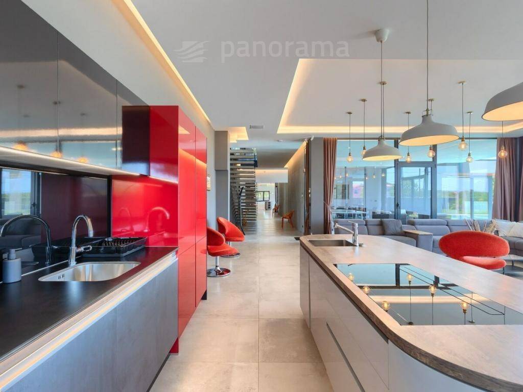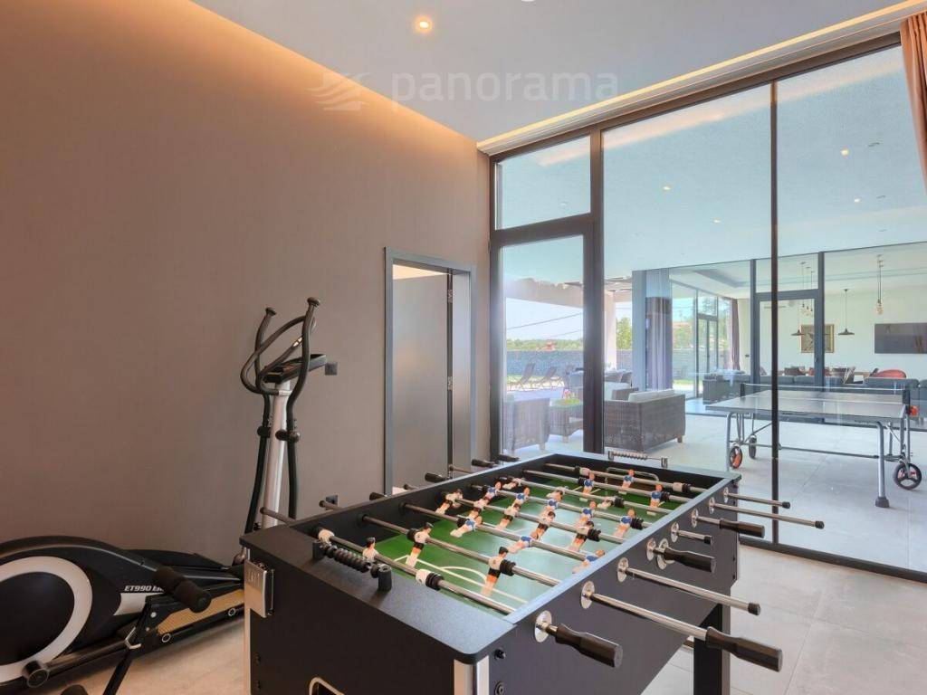The terraces stretch the width of the entire house, and below there is a swimming pool bordered by a sunbathing area and a green area. The pool has an area of 40 m2, heated by a 15 kW inverter heat pump + solar panels on the roof of the building. It has the most up-to-date disinfection of the train over salt, creates natural chlorine through electrolysis, and has an added UV sterilizer. One side of the pool has a 7 cm thick glass wall made of tempered laminated glass, giving the impression of an aquarium from the front.