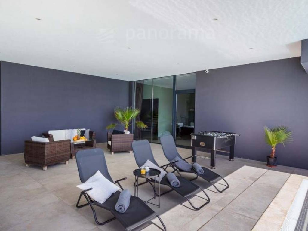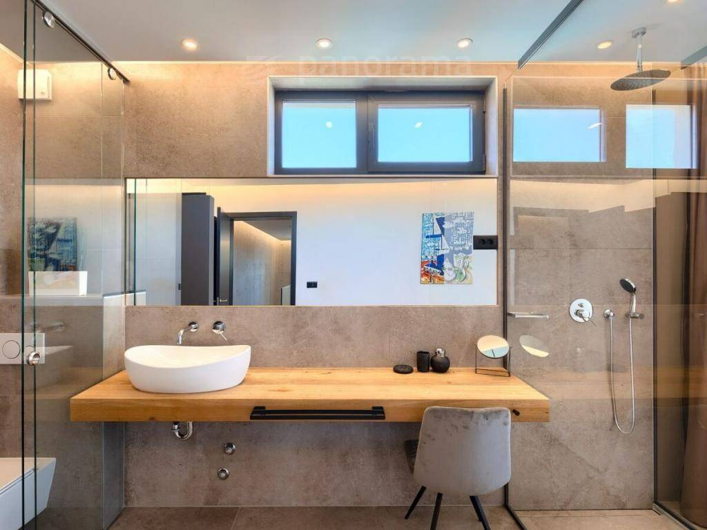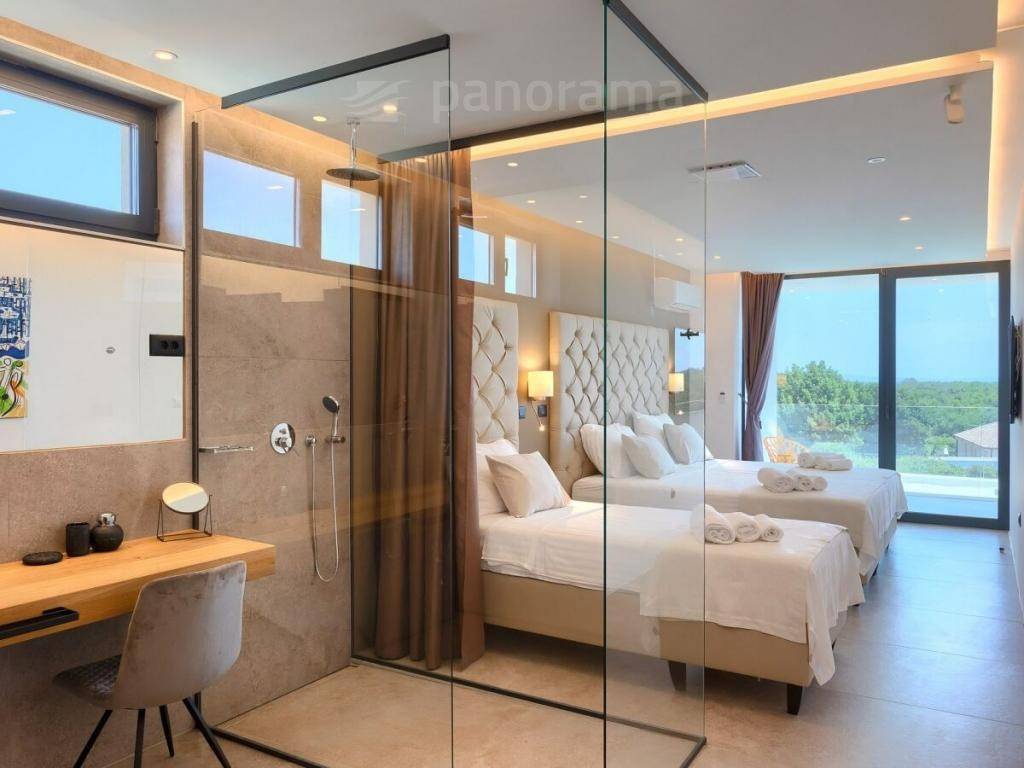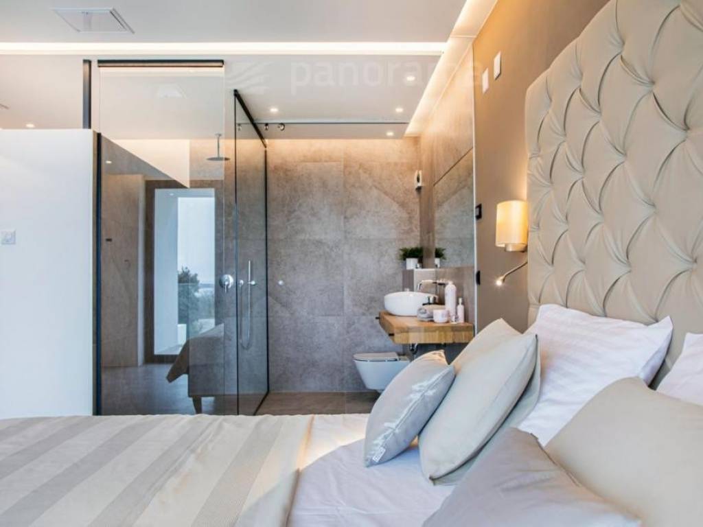 On the ground floor of the villa there is an open space living room with kitchen and dining room, and a space for leisure, all with access to an impressive covered terrace, and 1 bedroom with bathroom and toilet. Upstairs there are 3 more bedrooms with their own bathrooms and access to the terrace with a beautiful view of the sea and the bay. The rooms are larger than average, with glass walls from floor to ceiling, designed and furnished. The complete equipment is luxurious, high-class, with many combinations of indirect and direct lighting in the rooms.