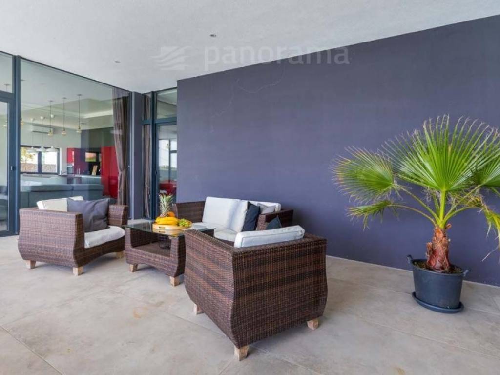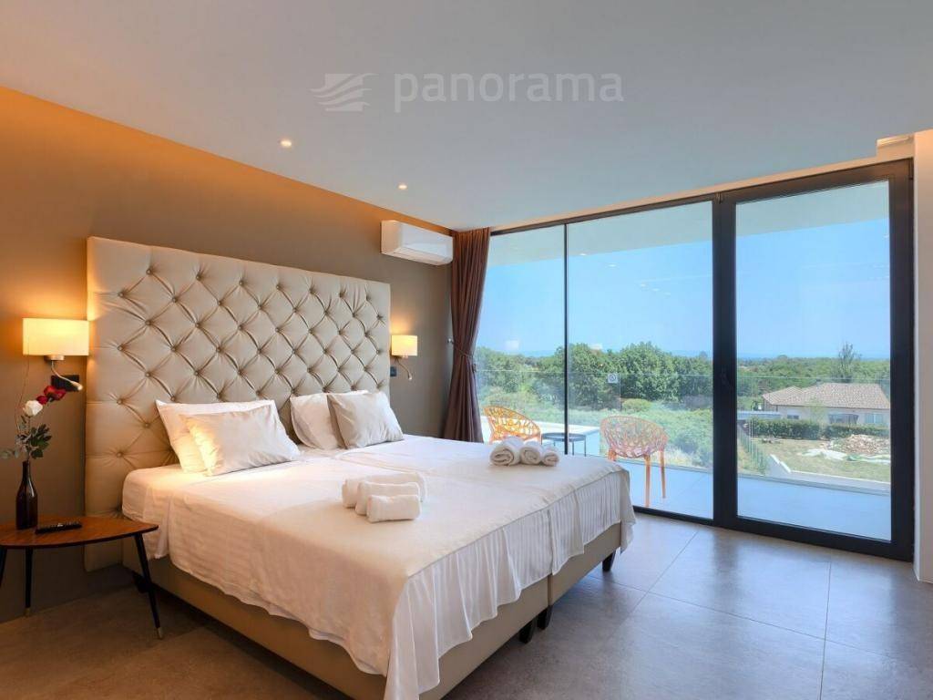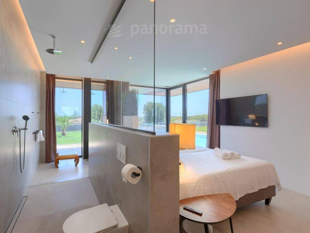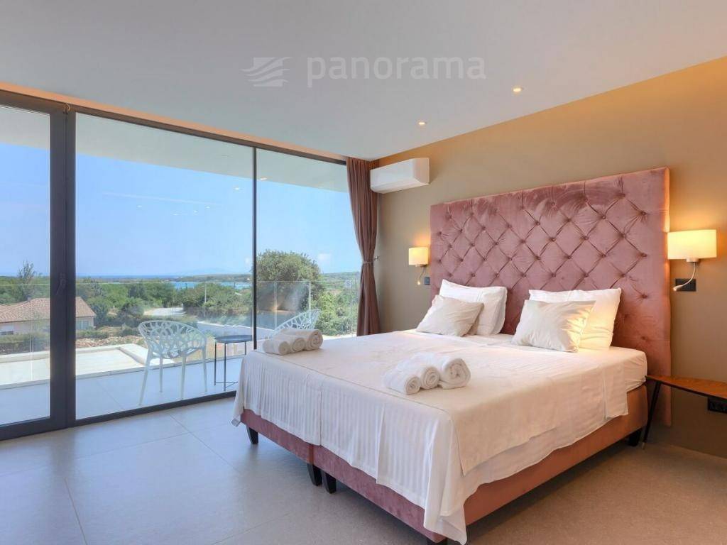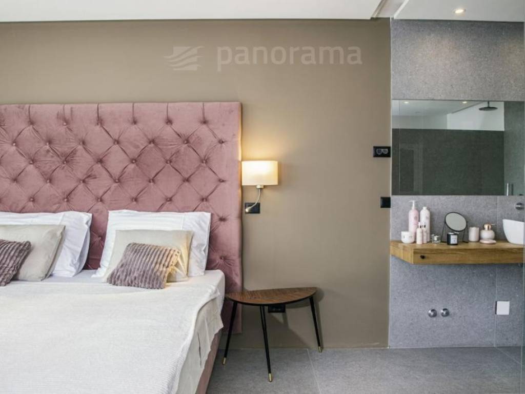 On the ground floor of the villa there is an open space living room with kitchen and dining room, and a space for leisure, all with access to an impressive covered terrace, and 1 bedroom with bathroom and toilet. Upstairs there are 3 more bedrooms with their own bathrooms and access to the terrace with a beautiful view of the sea and the bay. The rooms are larger than average, with glass walls from floor to ceiling, designed and furnished. The complete equipment is luxurious, high-class, with many combinations of indirect and direct lighting in the rooms.