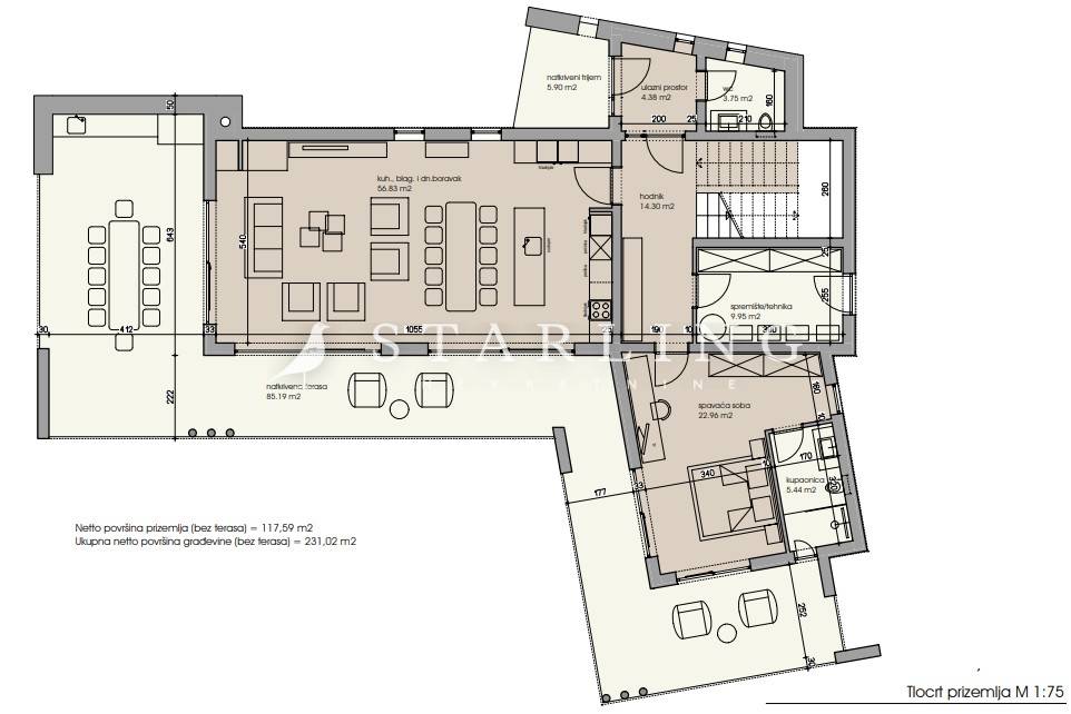 Vila bi u prizemlju sadržala open space kuhinju s dnevnim boravkom i blagovaonom, spavaću sobu sa svojim kupatilo, WC, spremište, te veliku ljetnu kuhinju s terasom.