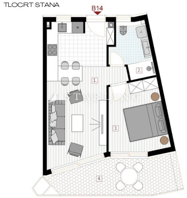 APARTMENT, SALE, NEW BUILDING, PULA, 50.46 m2 Luxury apartment with a total living area of 50.46 m2, in a fantastic location, first row to the sea, with a beautiful view of the sea. The apartment is located on the first floor of an urban residential building that has a total of thirty-six apartments. The apartment consists of an entrance hall with a wardrobe, a bathroom. living room with kitchen and dining area, bedroom, and loggia. The apartment is sold on a 'turnkey' basis, with a fully equipped bathroom (with associated furniture and sanitary ware), with floor coverings in all rooms together with white walls and ceilings, with all electrical installations and installed air conditioners, and installed all internal and external carpentry. The assembled entrance door will be anti-burglary and fire-proof. Also, the apartment will have an antenna system as well as a UTP network. Apart from the bathroom, the apartment is sold unfurnished. Parking space is paid additionally. All parking spaces are located in the underground levels of the building. Also, with the apartment, it is possible to buy a storage room with an additional charge. The storage rooms are located on the same levels as the parking spaces. Completion of the construction is planned for the middle of 2024. Heating/Cooling: air conditioning in all rooms. Orientation: west. Distance from the sea: 50 m. Ownership: 1/1, unencumbered. Price: 283,900 euros.