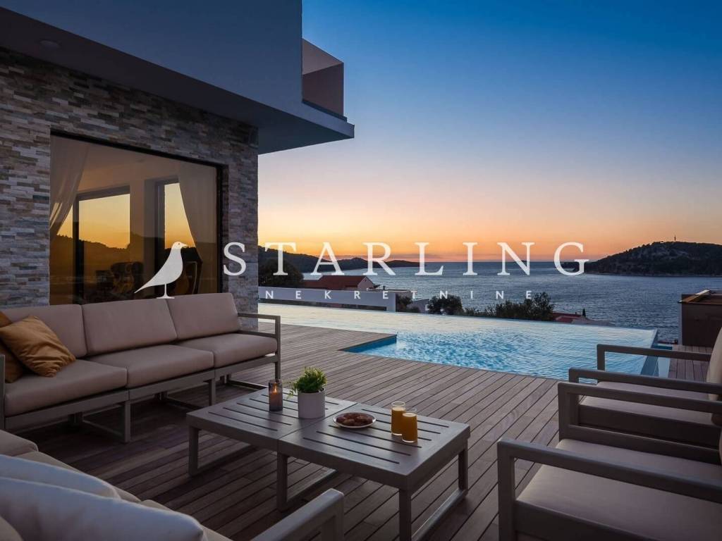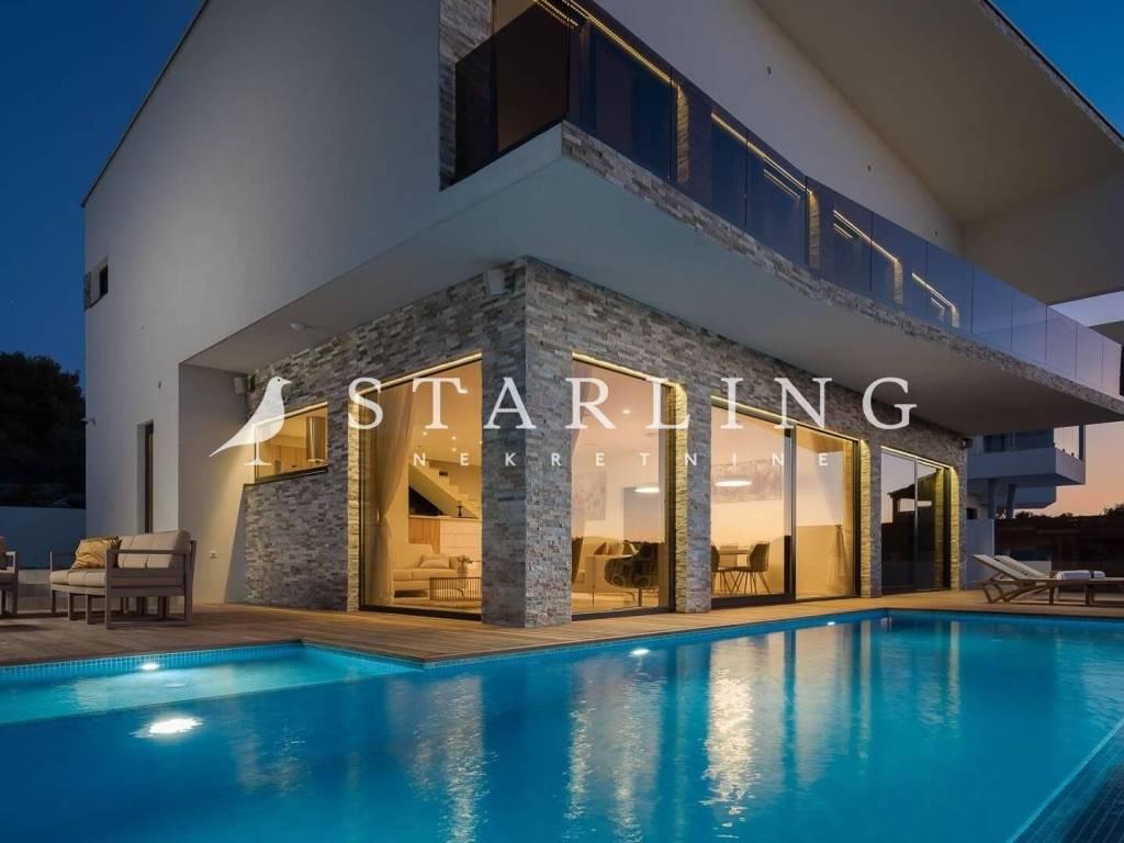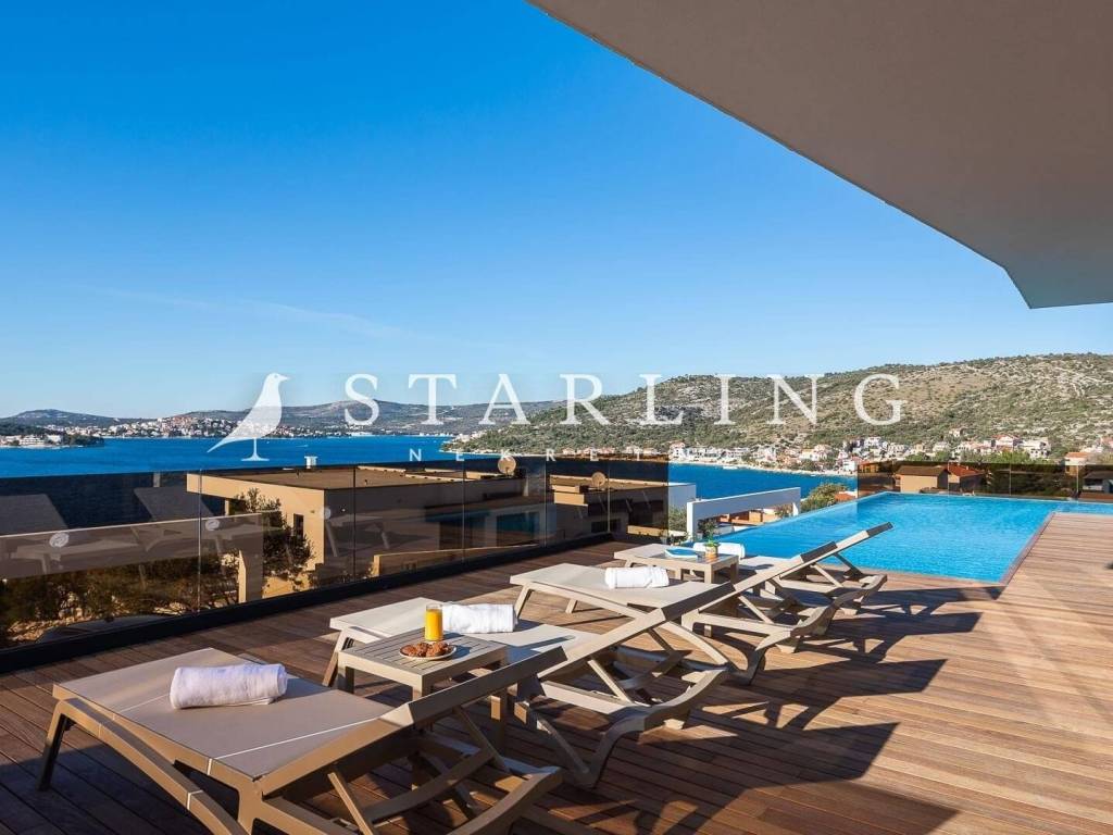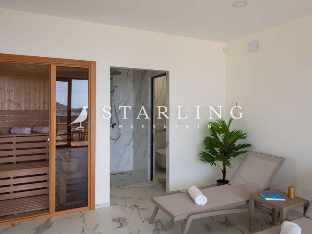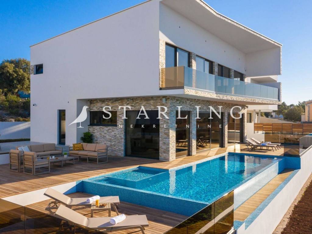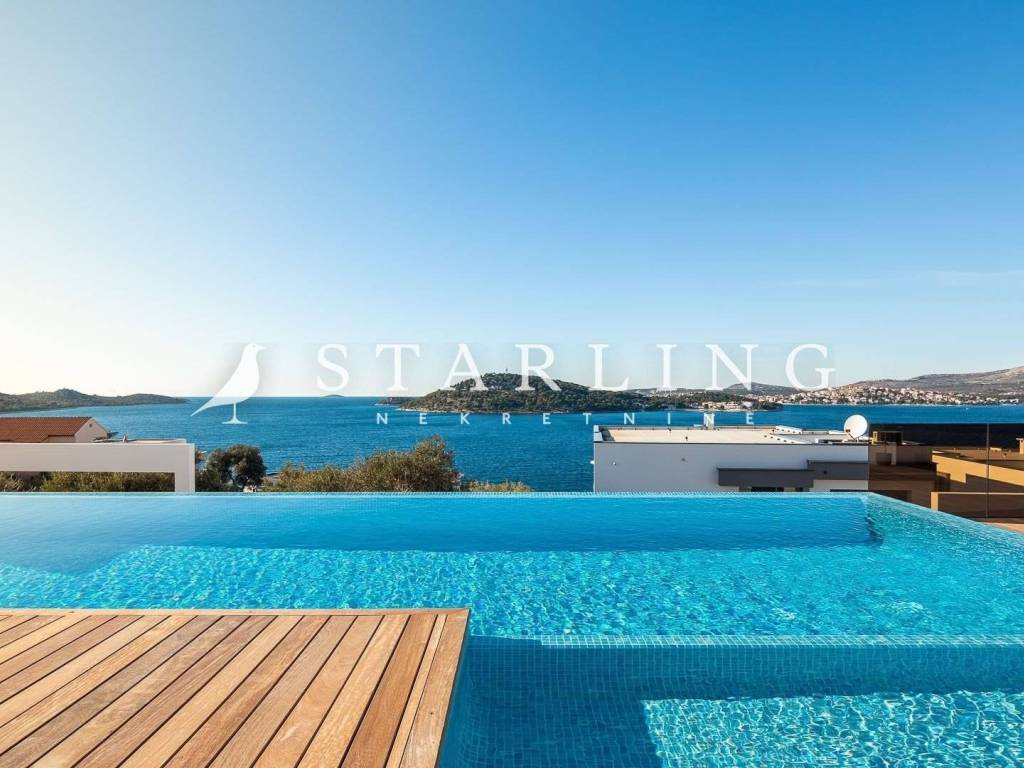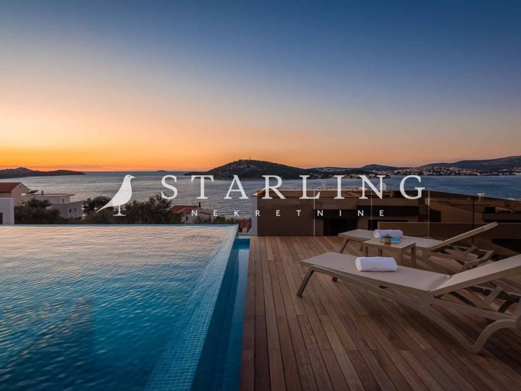 LUXURY VILLA, FOR SALE, ROGOZNICA, RAŽANJ, 260 m2 Detached villa of 260 m2 for sale. It is located on a plot of 674 m2. This modern villa is located in a row of a luxury complex of 3 sister villas. All three villas have the same concept and design. This villa consists of: GARDEN: heated swimming pool (38 m2), terrace, landscaped lawn and driveway with parking for 3 vehicles. GROUND FLOOR: open-concept kitchen connected to the living room and dining room, bedroom with private bathroom, toilet, sauna with shower, laundry room, storage room, and exit from the living room to the outdoor terrace through a large glass wall. FIRST FLOOR: 4 bedrooms with private bathrooms and wardrobe. Luxury villa, 260 m2, is located in a quiet Dalmatian town near Rogoznica in a closed complex of villas. A combination of modern architecture and natural surroundings with a unique view of one of the most beautiful sunsets that sets directly into the sea, this villa is a hit! Four fully equipped bedrooms with double beds are located on the upper floor with a beautiful view of the sea. Each room has its own private bathroom with toilet. On the ground floor there is a spacious living room, kitchen, dining room and laundry room with a washing machine and dryer, a separate bathroom and a wellness room with a sauna and a hot tub where you can fully indulge in all the pleasures of wellness relaxation with a beautiful view of the sunset. On the large terrace of 140 m2 (110 m2 of teak) there is a heated infinity pool. In addition to heating, the 1.45 m deep and 10 m long pool has a cooling option and includes a children's pool. The location of the villa provides shade and sun throughout the day. There is a parking lot with three parking spaces in the completely fenced yard of the villa. Near the villa there is a pebble beach typical of the Dalmatian coast. The enchanting sea coast hides various specialties that are located in the immediate vicinity of the villa. One such place is Zmajevo oko, a small salt lake located on the Gradina peninsula near Marina Frapa. A little further away is hidden Plava uvala, perfect for idyllic afternoons in the company of loved ones. If you want to rent a boat or reach the villa with your own boat, you have a private mooring at the nearby Frapa Marina. In a position that ensures complete privacy and peace, not far from the villa there are various amenities such as bars, restaurants, shops, etc. For all those who prefer sightseeing and exploring cultural and historical monuments, the historical cities of Šibenik in the north and Split in the to the south. Orientation: North - South Built: 2019 Parking: 3 places Price: 1,480,000 EUR