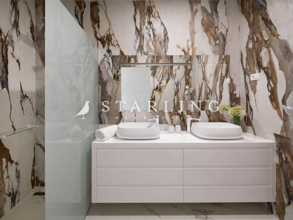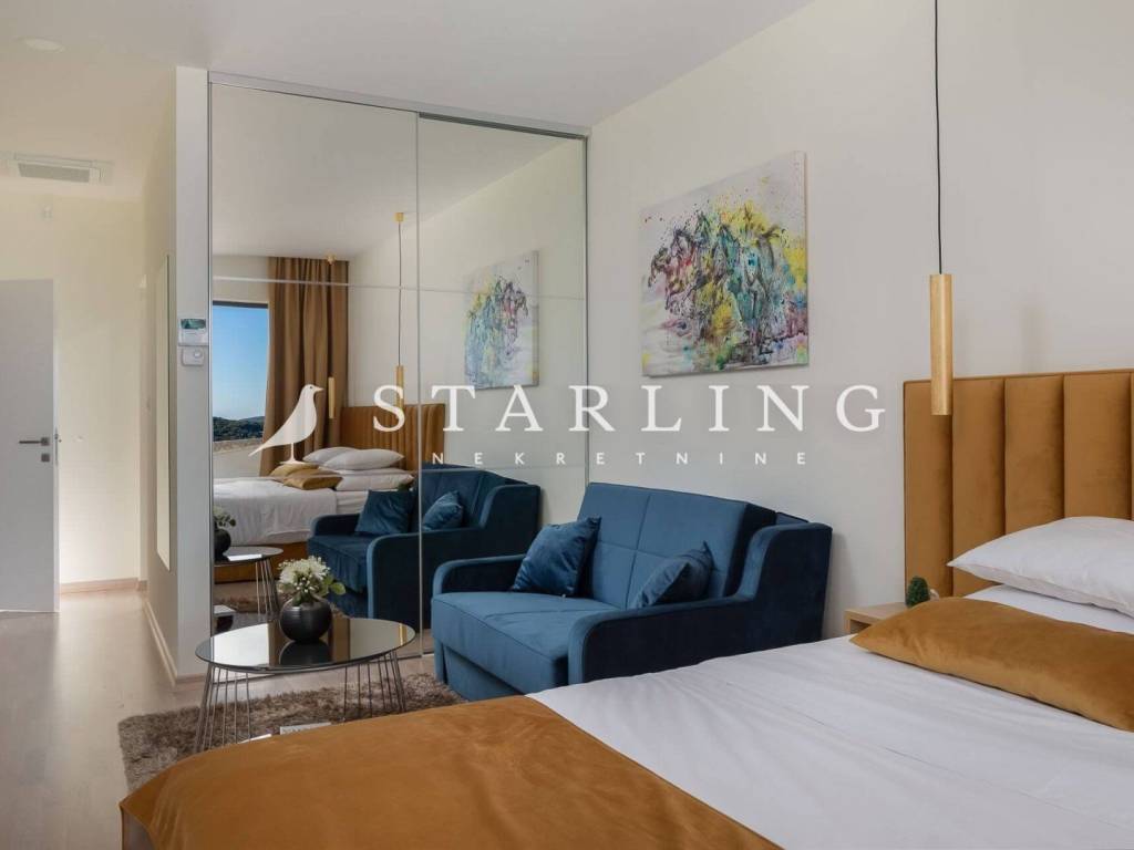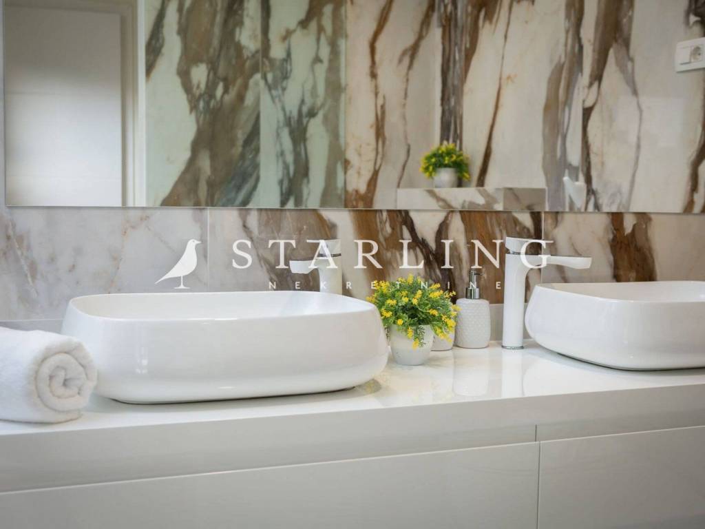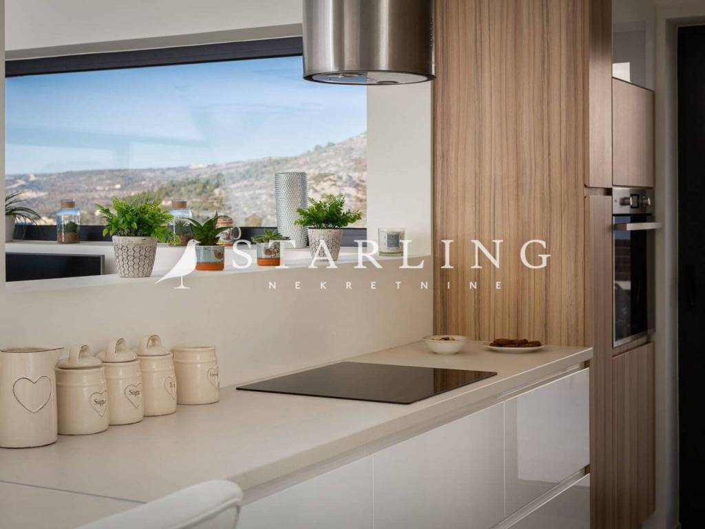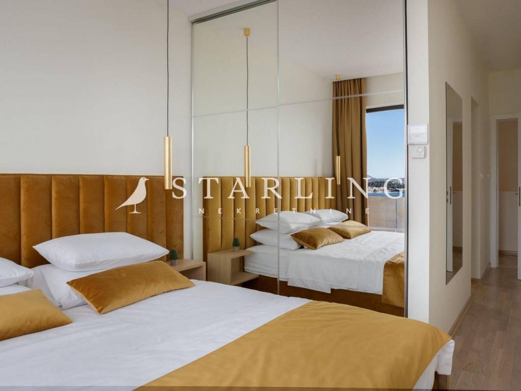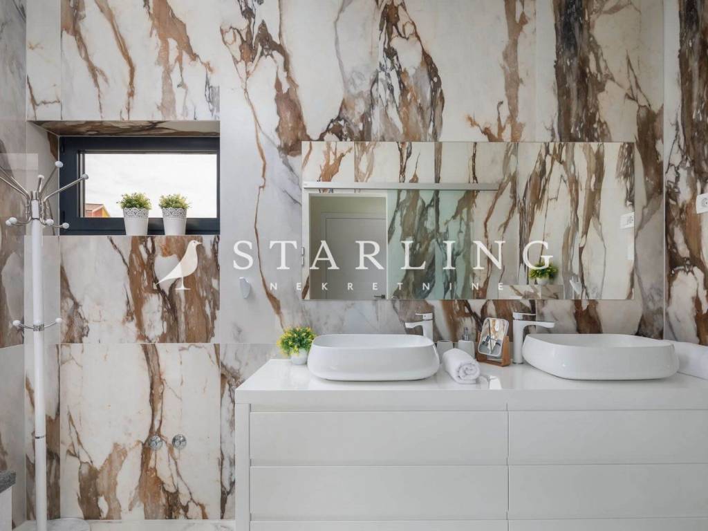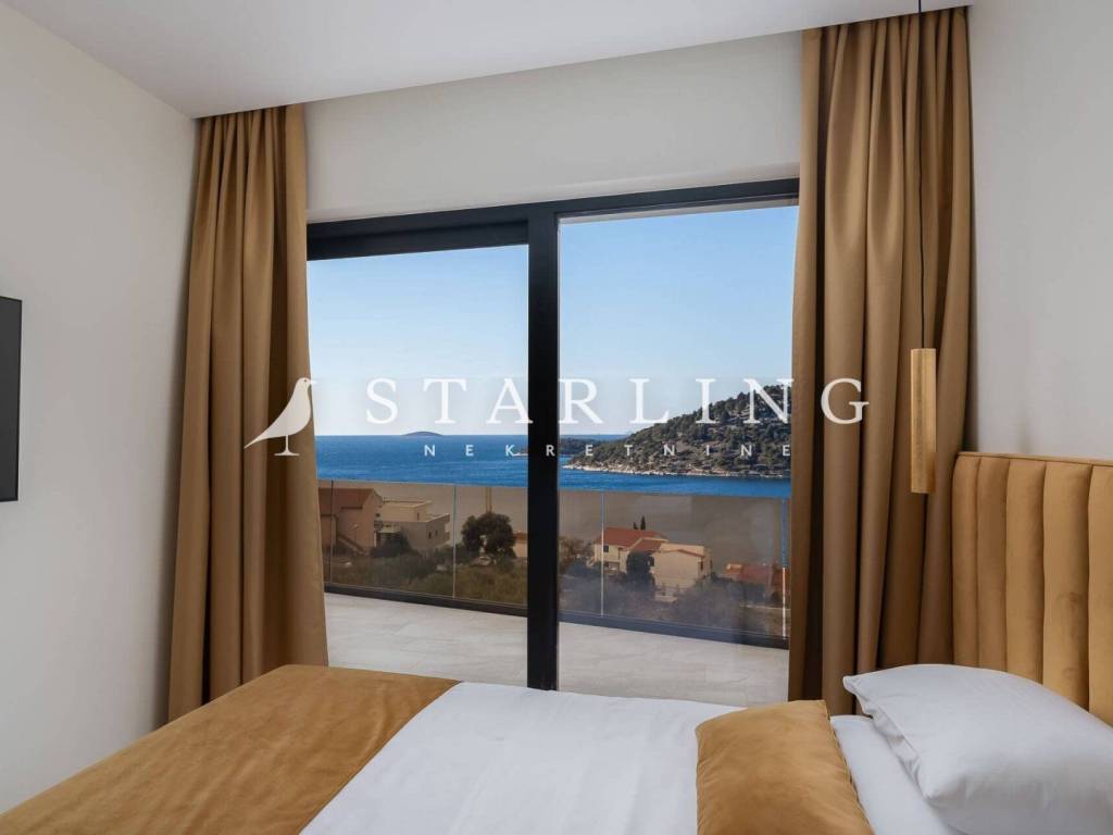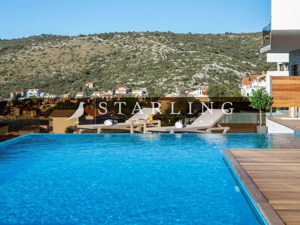 LUXURY VILLA, FOR SALE, ROGOZNICA, RAŽANJ, 260 m2 Detached villa of 260 m2 for sale. It is located on a plot of 674 m2. This modern villa is located in a row of a luxury complex of 3 sister villas. All three villas have the same concept and design. This villa consists of: GARDEN: heated swimming pool (38 m2), terrace, landscaped lawn and driveway with parking for 3 vehicles. GROUND FLOOR: open-concept kitchen connected to the living room and dining room, bedroom with private bathroom, toilet, sauna with shower, laundry room, storage room, and exit from the living room to the outdoor terrace through a large glass wall. FIRST FLOOR: 4 bedrooms with private bathrooms and wardrobe. Luxury villa, 260 m2, is located in a quiet Dalmatian town near Rogoznica in a closed complex of villas. A combination of modern architecture and natural surroundings with a unique view of one of the most beautiful sunsets that sets directly into the sea, this villa is a hit! Four fully equipped bedrooms with double beds are located on the upper floor with a beautiful view of the sea. Each room has its own private bathroom with toilet. On the ground floor there is a spacious living room, kitchen, dining room and laundry room with a washing machine and dryer, a separate bathroom and a wellness room with a sauna and a hot tub where you can fully indulge in all the pleasures of wellness relaxation with a beautiful view of the sunset. On the large terrace of 140 m2 (110 m2 of teak) there is a heated infinity pool. In addition to heating, the 1.45 m deep and 10 m long pool has a cooling option and includes a children's pool. The location of the villa provides shade and sun throughout the day. There is a parking lot with three parking spaces in the completely fenced yard of the villa. Near the villa there is a pebble beach typical of the Dalmatian coast. The enchanting sea coast hides various specialties that are located in the immediate vicinity of the villa. One such place is Zmajevo oko, a small salt lake located on the Gradina peninsula near Marina Frapa. A little further away is hidden Plava uvala, perfect for idyllic afternoons in the company of loved ones. If you want to rent a boat or reach the villa with your own boat, you have a private mooring at the nearby Frapa Marina. In a position that ensures complete privacy and peace, not far from the villa there are various amenities such as bars, restaurants, shops, etc. For all those who prefer sightseeing and exploring cultural and historical monuments, the historical cities of Šibenik in the north and Split in the to the south. Orientation: North - South Built: 2019 Parking: 3 places Price: 1,480,000 EUR