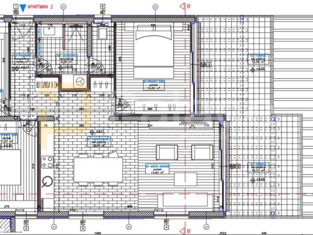 For sale, a luxurious three-bedroom apartment in building A with a total area of 99 m2 in a new building in Šparadići, first row to the sea, consisting of a net living area of 88.52 m2, a terrace with sea view of 31.50 m2, and an outdoor covered parking space.