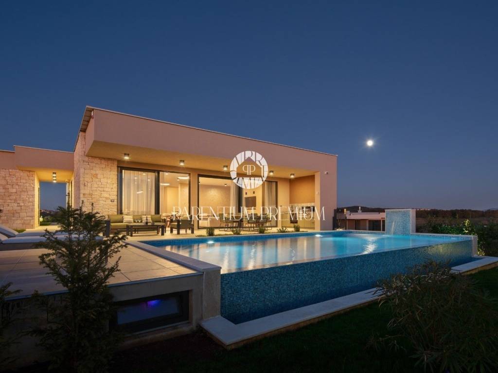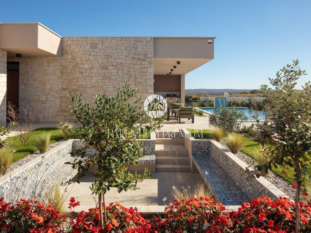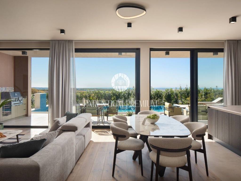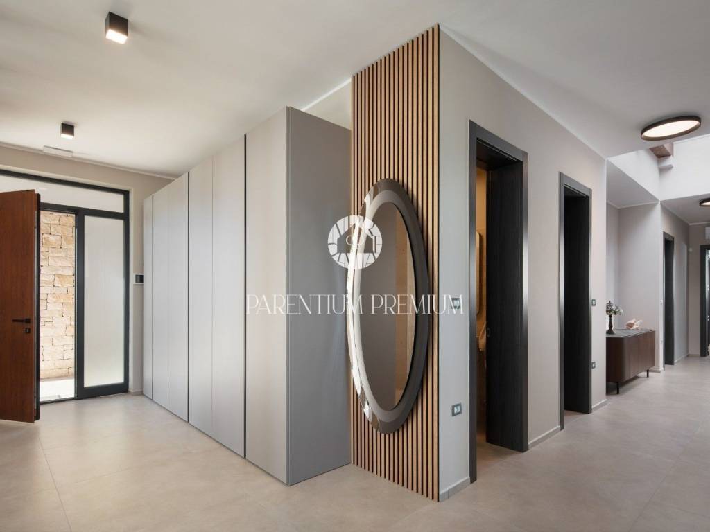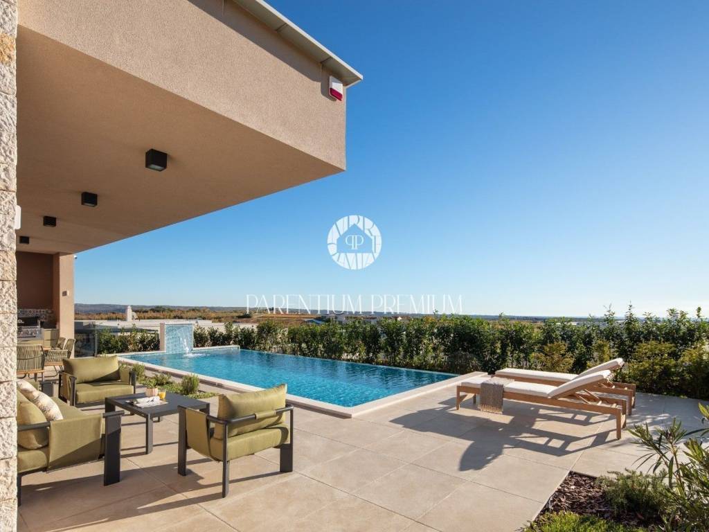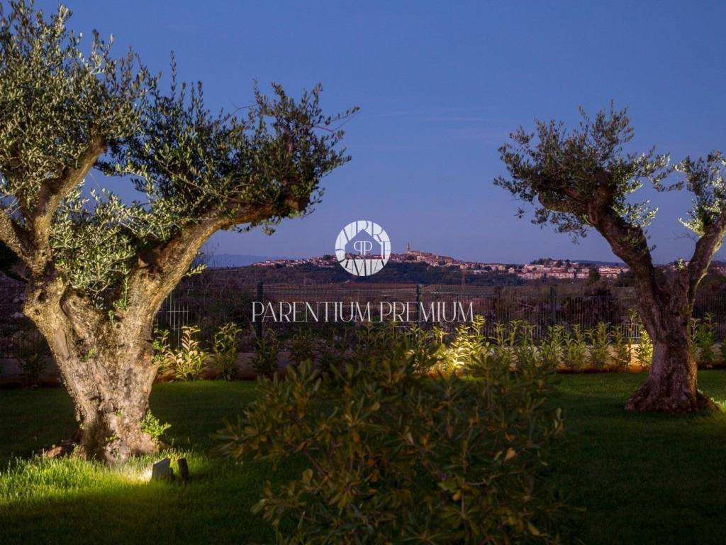 Istria, NovigradOn a gentle hill, in the heart of magical Istrian nature, surrounded by vineyards and olive groves stretching to the horizon, lies this contemporary luxury villa – a home that blends elegant modern design with the warmth of the Mediterranean. Surrounded by complete tranquillity and greenery, the villa offers 320 m² of living space on a spacious plot of approx. 1,500 m². Every corner has been carefully designed to provide the perfect balance of luxury, privacy and comfort, with beautiful views of the sea, vineyards, and the rolling hills of Buje and Brtonigla. The sea is just 6 kilometres away, offering an ideal combination of coastal proximity and absolute peace.The villa is situated at the intersection of three countries – Croatia, Slovenia and Italy. The location is strategically exceptional: Trieste is only 35 km away, while winter ski resorts are reachable in just 2.5 hours. Three international airports are nearby (Pula 45 min, Trieste Ronchi 45 min, Ljubljana 1.5 h), with Venice and Treviso around 2.5 hours away. The private airport of Portorož is just 15 minutes away, making this property highly attractive for investors, yacht owners, business travellers, family offices and luxury buyers from across Europe.The villa is positioned to enjoy sunlight throughout the entire day, with impressive sunsets stretching over the sea.It is spread over two levels:The lower level features a wellness area with sauna, gym, entertainment/lounge space (which can be converted into a home cinema), storage and a technical room.The ground floor consists of the main living area – four spacious bedrooms each with its own en-suite bathroom, a guest toilet, and an open-plan living room with a fireplace, kitchen and dining area. Large glass walls connect the interior with the outdoor terraces and loggias, creating a sense of openness and unity with nature. On the sunny terrace, there is a heated infinity pool of 40 m² and 1.7 m depth, finished with ceramic tiles and equipped with a water electrolysis system.The villa is newly built and fully furnished with premium materials and contemporary design. It is equipped with underfloor heating via a heat pump, air conditioning units, and a fireplace in the living room.The landscaped garden features authentic Mediterranean greenery, olive trees and lavender, while the spacious yard and stone-paved terrace provide an ideal place for relaxation and outdoor enjoyment.Brtonigla is one of the most charming Istrian towns, known for wine, olive oil and excellent gastronomy. The villa is located in a peaceful area with breathtaking views, close to renowned wineries, cycling routes and traditional taverns. The sea and beaches are only ten minutes away.This villa is not just a home – it is a peaceful, luxurious lifestyle immersed in nature, with a view that inspires every single day. Perfect as a family residence, holiday home or high-end rental investment.