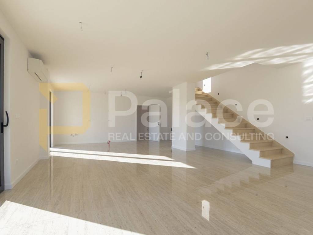 An internal staircase also leads to the first floor where three bedrooms with bathrooms are located, one of which has its own dressing room. Each room has access to the outdoor space on the balcony and terrace. Underfloor heating is provided throughout all rooms, as well as air conditioning systems, while the gardens are equipped with an irrigation system.