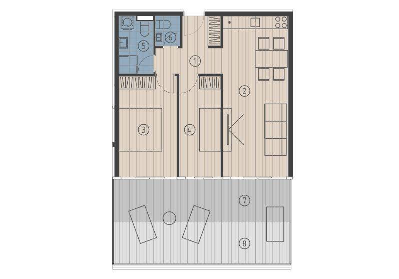 - kitchen, dining area, and living room 22.84 m²