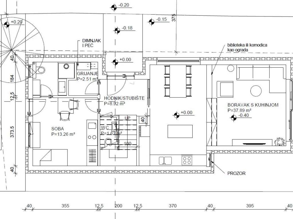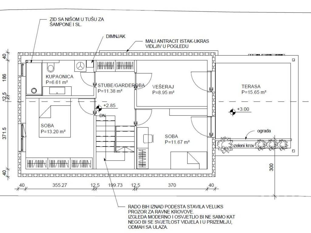 Površina zemljišta iznosi 297 m2, namjena je stambena (S), a vrijede urbana pravila 2.2. Ishođena je pravomoćna građevinska dozvola za gradnjukatnice od 70 m2 tlocrtno, dakle 140 m2 bruto i 127 m2 neto (neto površina gornje etaže je manja zbog terase od 16 m2 koja se obračunava po koeficijentu 0,25).