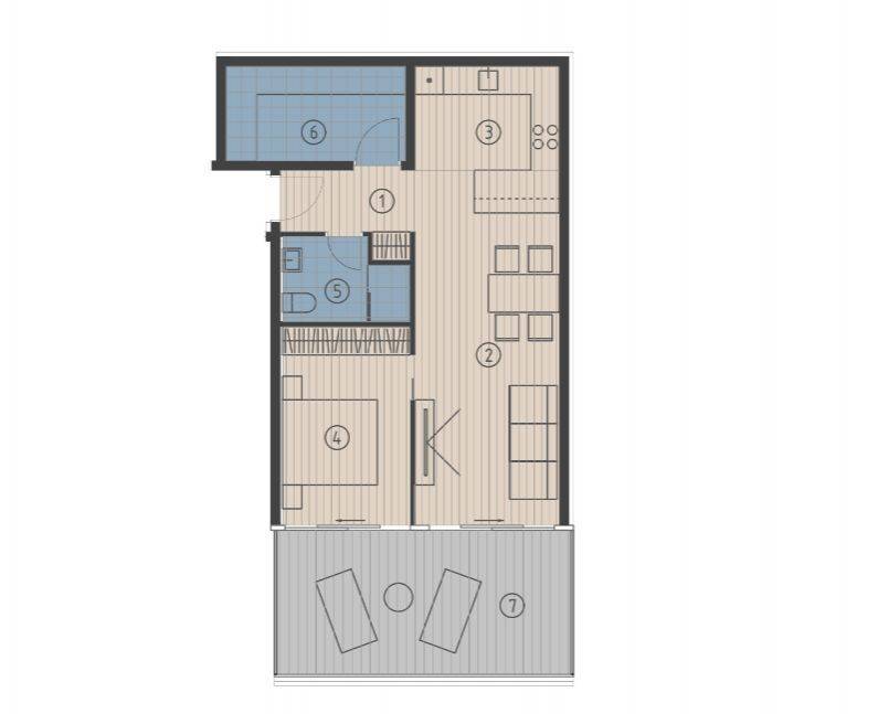 The one-bedroom apartment A04 is located in the basement of the new building, with a total area of 77.12 m² and includes: