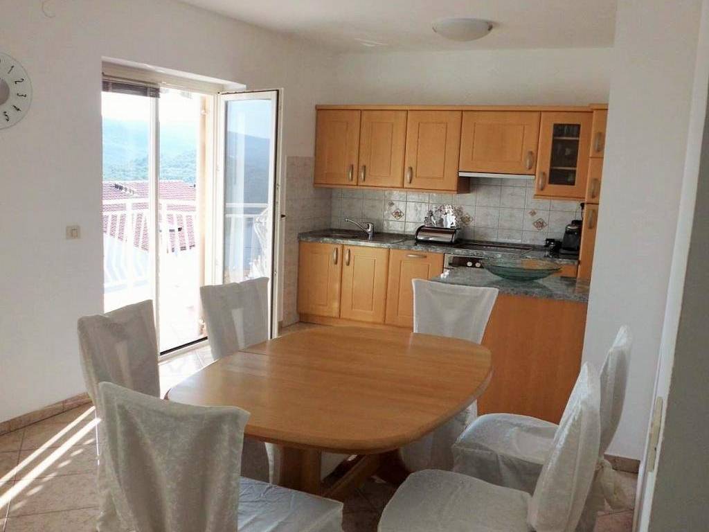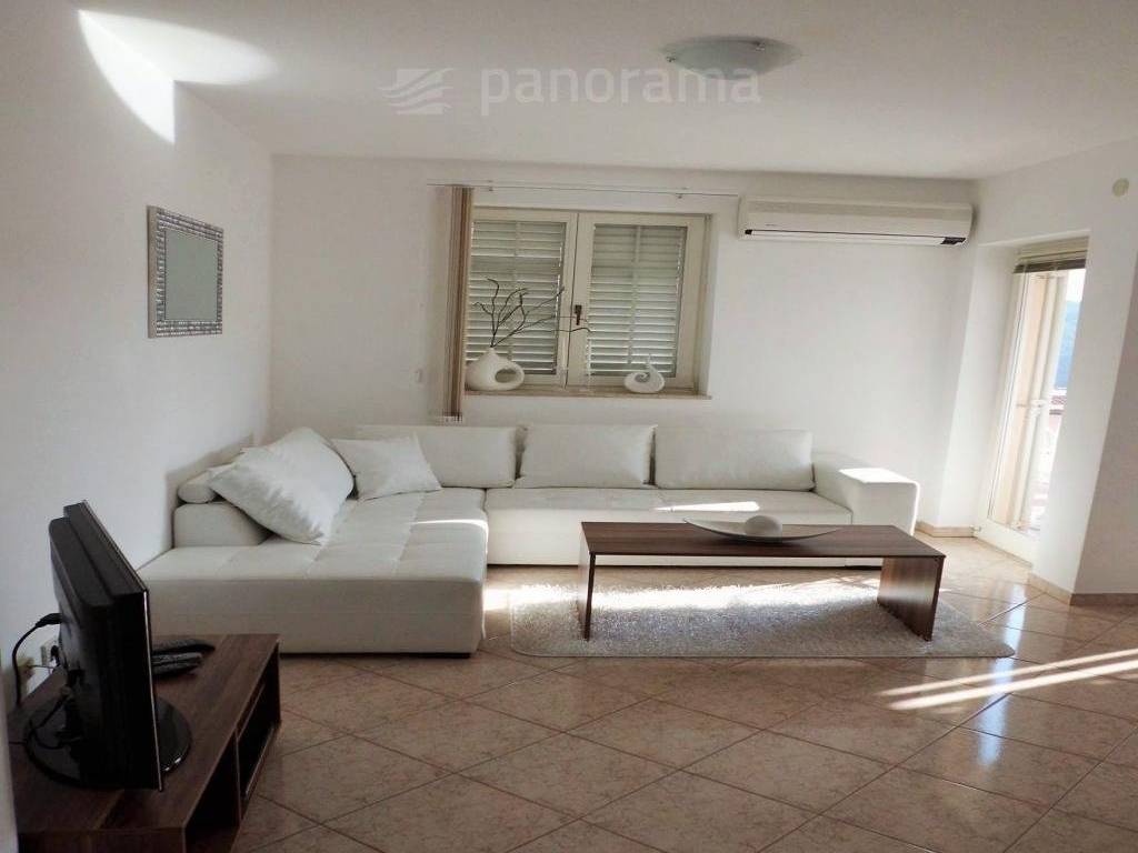 The apartment has a total area of 127 m2 and is spread over two floors (2nd floor and attic). The apartment consists of a hallway, a kitchen with a dining room, a living room, 2 bedrooms, a bathroom and a covered terrace with a beautiful, open view of the sea. An internal staircase leads to the attic, where there is another bedroom, bathroom and storage room. The apartment is sold together with furniture and equipment.