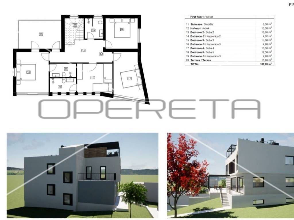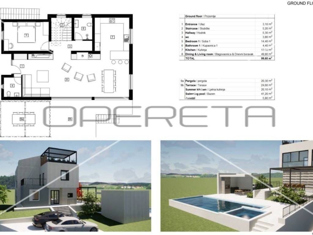 Vila prostire na tri etaže. U podrumu je planirano za fitnes, saunu, tehničku sobu, spremište i zasebnu garažu za automobile. Na prvom katu gdje je planiran prostrani dnevni boravak, blagovaonica i kuhinju po open space konceptu, spavaća soba, kupaonica i wc. Iz dnevnog boravka bi se izlazilo direktno na natkrivenu terasu s pogledom na more. Na drugom katu u projektu su još dodatne četiri spavaće sobe, od kojih dvije bi imale vlastite kupaonice, a druge dvije imale bi jednu zajedničku kupaonicu. Na krovištu se nalazi krovna terasa natkrivena pergolom te koja pruža otvoren panoramski pogled na more. U dvorištu je isplanirana ljetna kuhinja.