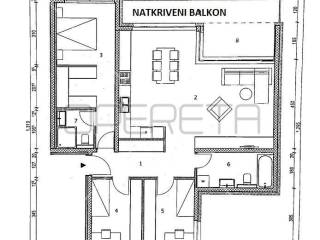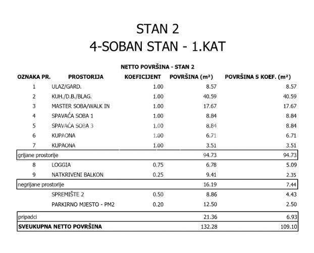 Četverosoban stan u kojem dominira "open space" dnevni boravak s blagovaonicom i kuhinjom, kompletno zapadnom stranom u staklenim stijenama, s izlazom na loggiu od 16 m2. Također imamo dvije sobe, kupaonicu s wc-om i glavnu spavaću sobu s velikim " walk in" ormarom i vlastitom kupaonicom. Spremište-soba od skoro 9m2 u prizemlju uz garažu. Garaža ima priključak za punjače za hibridne ili elektro automobile. Stanu pripada i jedno vanjsko parkirno mjesto.