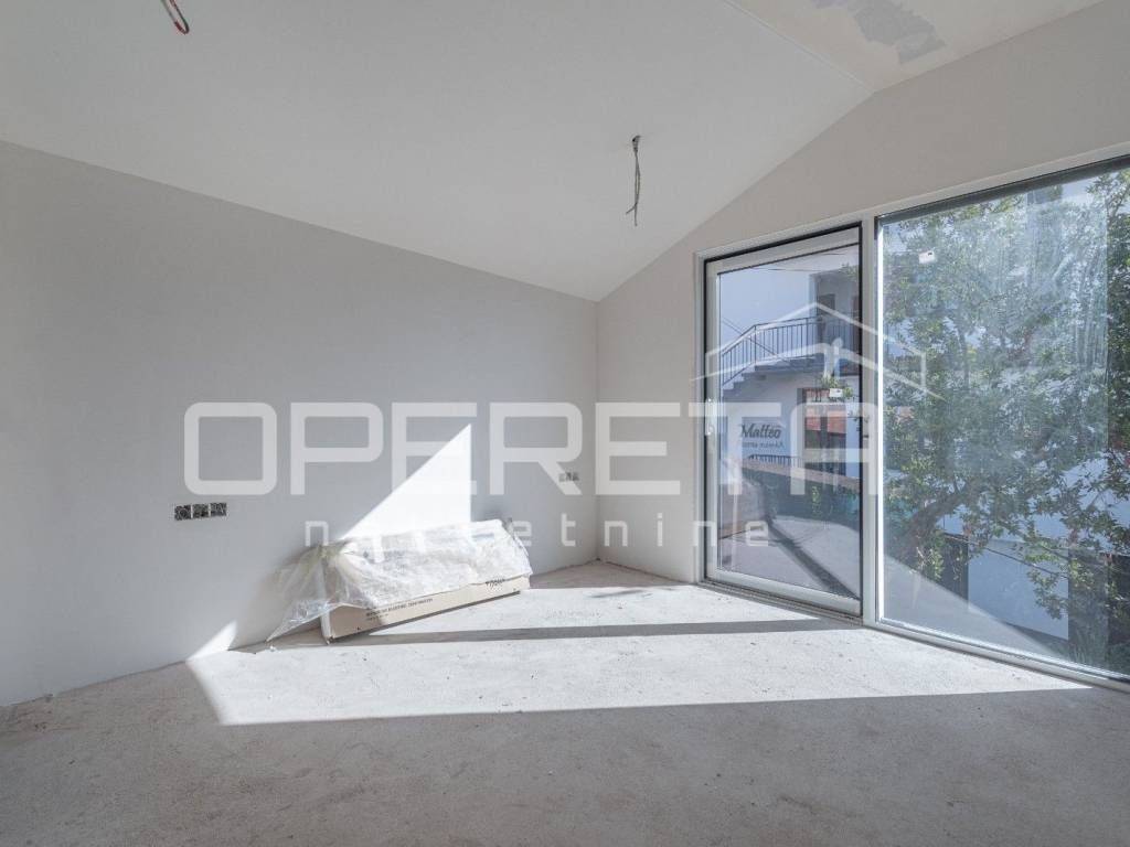 The bathrooms are equipped with ceramic tiles and sanitary ware by Geberit, complemented by Hansgrohe Axor faucets. Security features include a video surveillance system, alarm, and reinforced entrance doors. The staircase is finished with Brač stone, while the façade features 10 cm styrofoam with fire protection zones and STO finish. Each apartment has separate infrastructure, and landscaped surroundings with yard lighting further enhance the living experience.