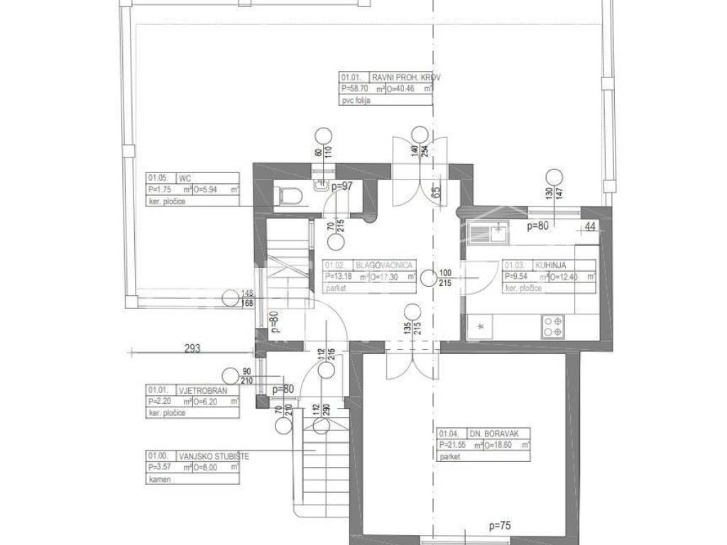 Ovaj dio kuće ima poseban ulaz te je idealan za poslovne namjene ili za najam. Također se može povezati stepeništem s ostatkom kuće te dobiti jednu povezanu cjelinu.