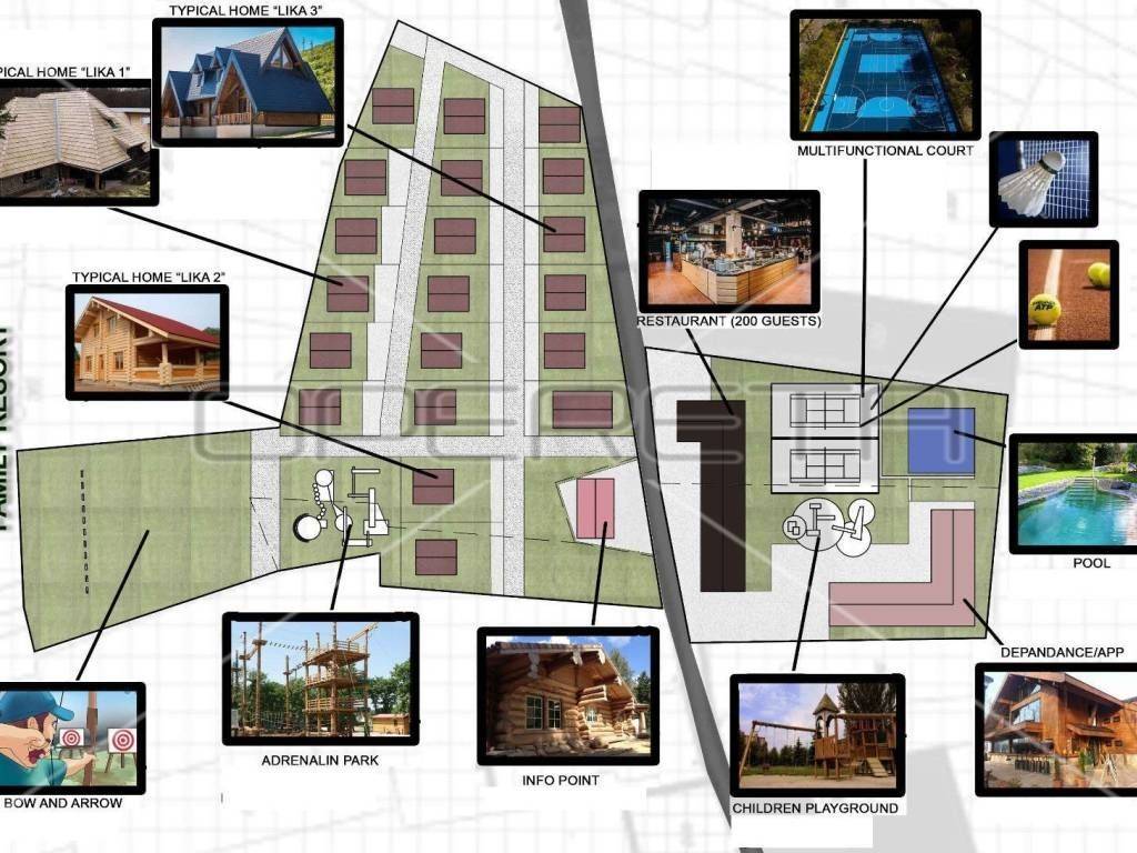 Predviđena je gradnja 20 tipičnih drvenih ličkih kuća s info centrom, adrenalinskim parkom, sportskim terenima, restoranom za 200 gosti, bazenom, prostorom za zabavu i parkingom.