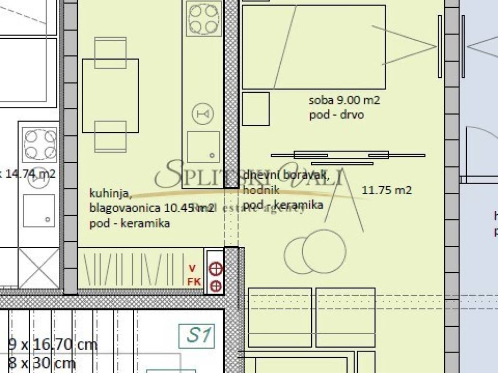 Sastoji se od dnevne sobe, kuhinje s blagovaonicom, spavaće sobe, kupaonice te natkrivenog balkona.