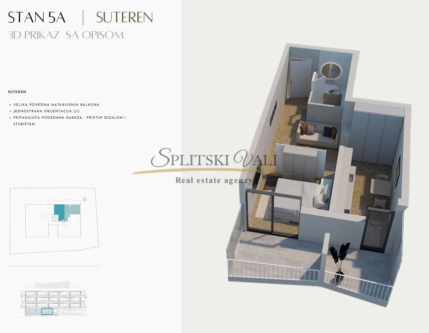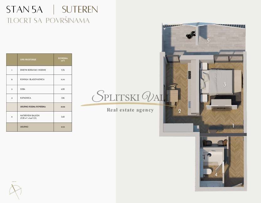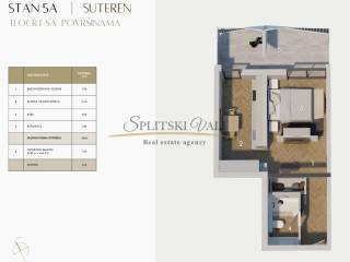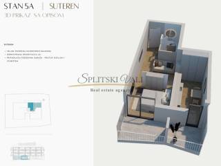 Stan 5A nalazi se na razini suterena te se prostire na 41.10m2 netto površine, 35.5m2 unutarnje površine.