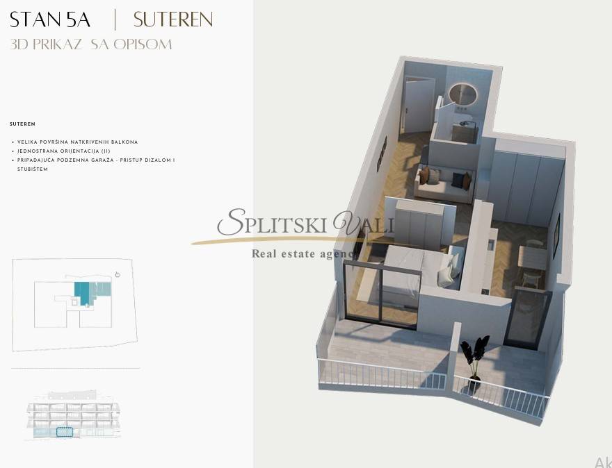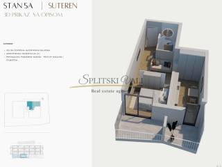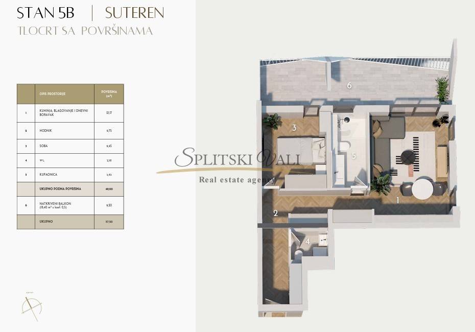 Stan 5B nalazi se na razini suterena te se prostire na 57.72m2 netto površine, 48m2 unutarnje površine.