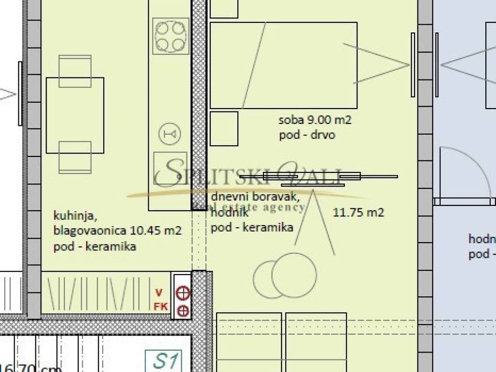 Sastoji se od dnevne sobe, kuhinje s blagovaonicom, spavaće sobe, kupaonice te natkrivenog balkona.