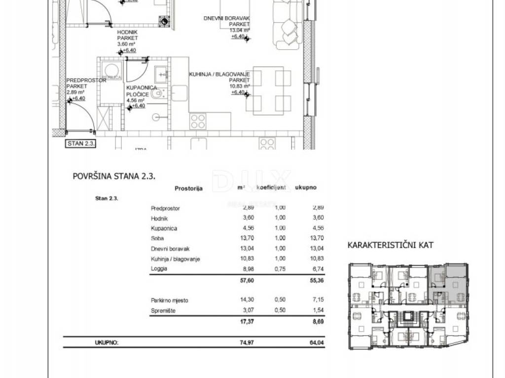 We are selling a one-bedroom apartment with a living room marked 2.3 on the second floor of a top new residential building in a phenomenal and unique location. The apartment consists of an entrance hall, an open space concept living area with a kitchen and dining room with access to a loggia, one bedroom and a bathroom with a total net living area of 57.60m2. The apartment comes with one garage parking space of 14.30m2 as well as a storage room in the garage of 3.07m2.