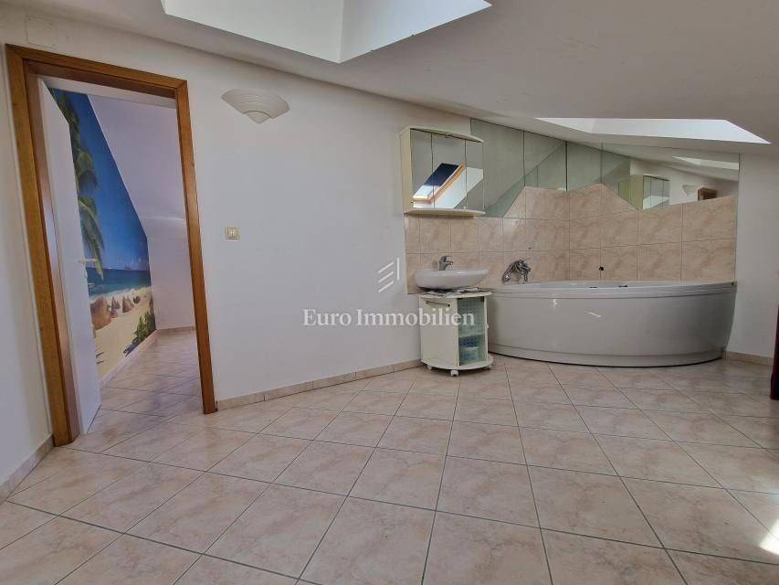 The apartment spans over two floors, high ground floor and attic and has open sea view from both floors. On the high ground floor is an entrance hall, a living room with a kitchen and dining area, a bedroom, a bathroom and a loggia with sea view. On the loggia is a barbecue. On the upper floor is a large bedroom, a fitness room with a jacuzzi, an electrical connection for a sauna that can be built in, as well as a terrace with a shower and an open sea view. There are mosquito nets on the balcony doors, and both floors are air-conditioned. The apartment was renovated in 2022, it is being sold fully furnished and ready for use. There is a children's playground and a grill with table and benches on the common yard. A parking space is also provided. All amenities are within walking distance from the apartment.