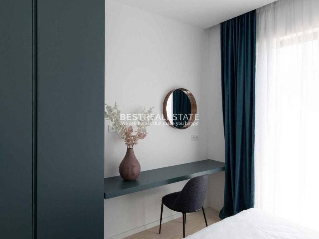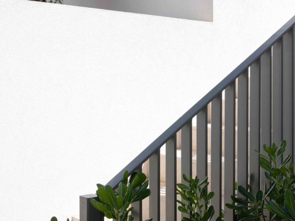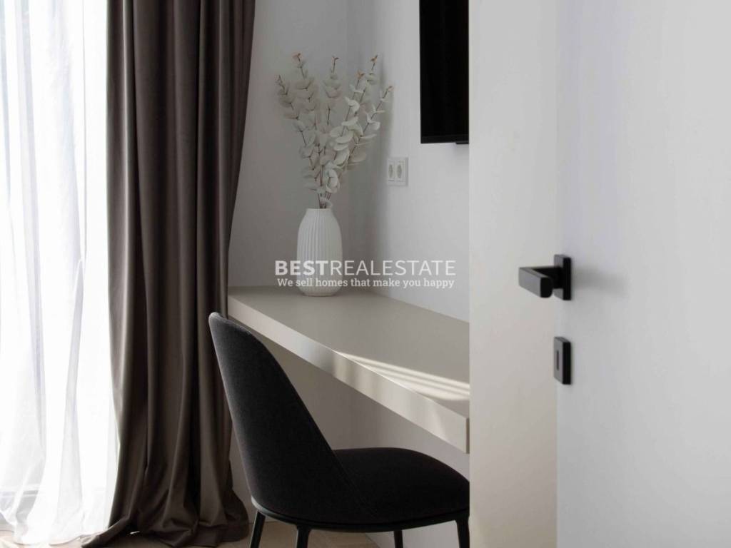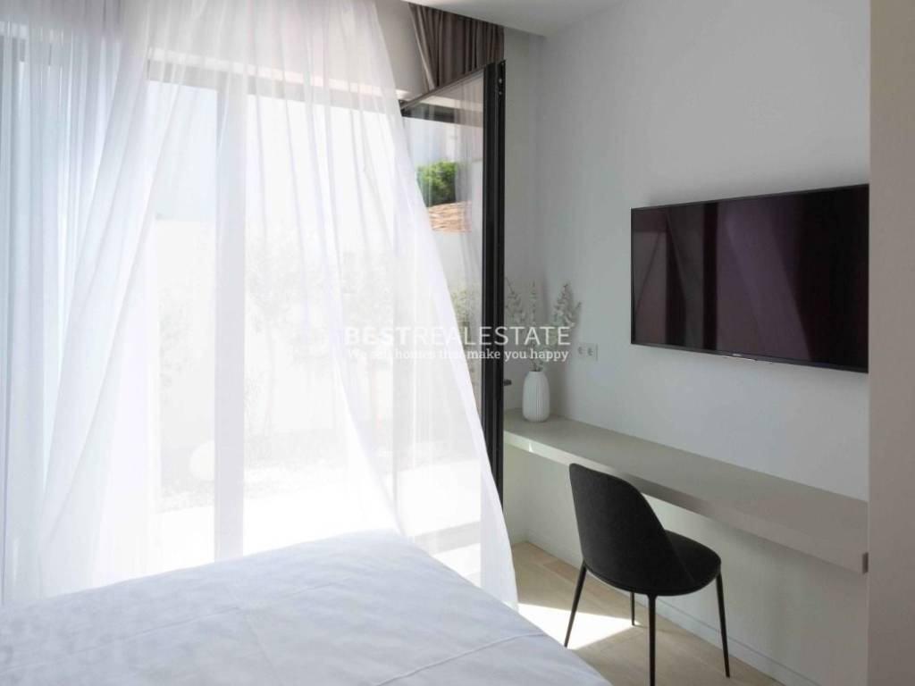 Unutrašnjost je izvedena s pažnjom na svaki detalj – cementna žbuka, glatke površine i prirodni kamen travertin koji se estetski povezuje s vanjskim prostorom vile. Vrhunska aluminijska stolarija renomiranog proizvođača Cortizo (model Cor Vision Plus) dodatno doprinosi osjećaju luksuza i otvorenosti prostora.
