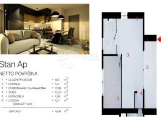 NEW BUILDING - APARTMENT IN ROGOZNICA, EXCELLENT LOCATION An apartment for sale in a new building in Rogoznica, located in an extremely attractive and quiet location, only 250 m from the sea and 800 m from the town center. The apartment is located in a residential building with a total of 6 residential units, and the total net area of the apartment is 43.41 m. Layout: Entrance area: 1.55 m Kitchen: 5.01 m Living room with dining room: 15.66 m Bedroom: 10.00 m Bathroom: 4.68 m Loggia: 8.68 m (6.51 m net) About the building: New construction on a plot of 653 m Located on elevated terrain with a beautiful panoramic view View of the islets of Jaz and Lukvenjak, and of Zatoglav and Ražanj Floor plan dimensions of the building: 13.92 mx 15.59 m Orientation of the building orthogonal to the cardinal points The building consists of one underground and three above-ground floors There are two residential units on each above-ground floor Storage spaces for each residential unit are provided in the underground floor Additional amenities: Pedestrian and vehicle access from the west side A total of 9 outdoor parking spaces Ideal holiday property, housing or tourist investment.