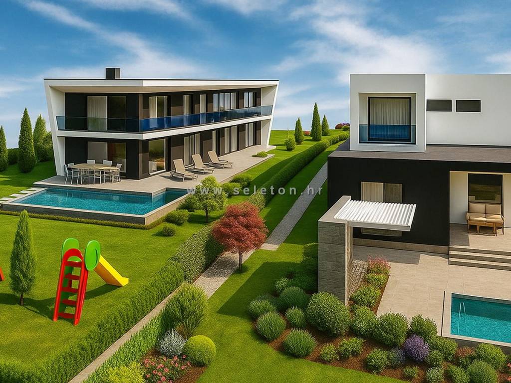 È in vendita una casa indipendente con una superficie totale di 243 m², composta da soggiorno, cucina, sala da pranzo, terrazza, locale tecnico/lavorativo, bagno per gli ospiti e una camera da letto con bagno al piano terra della casa, oltre a disimpegno, tre camere da letto con bagni e balcone al piano primo dell'abitazione. La casa avrà una piscina di 36 mq, una cucina estiva di 24 mq e un ripostiglio per piscina di 5 mq, riscaldamento a pavimento, aria condizionata in tutte le camere da letto e nel soggiorno, allarme, irrigazione automatica del giardino, videosorveglianza e 3 posti auto. La casa è costruita su un terreno di 1.080 m², si trova in un villaggio a ca. 12 km dal mare/spiaggia ea ca. 11 km da Poreč-Parenzo.