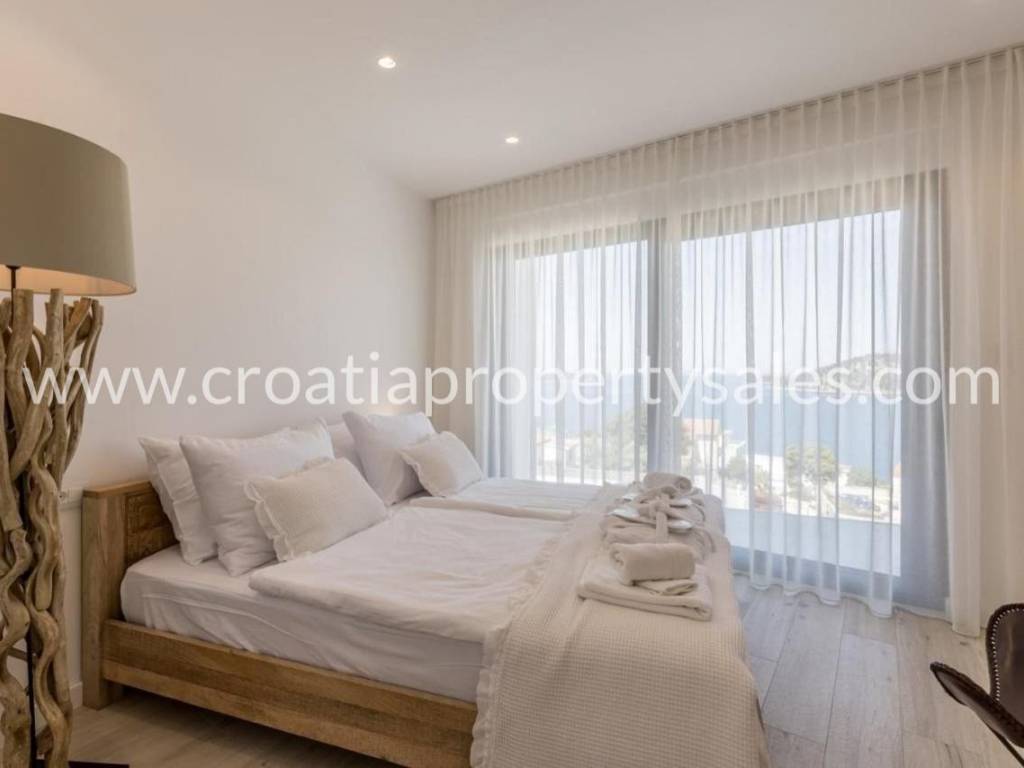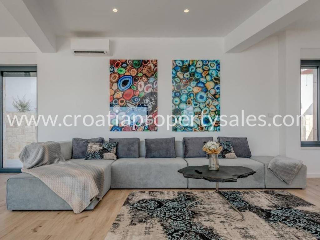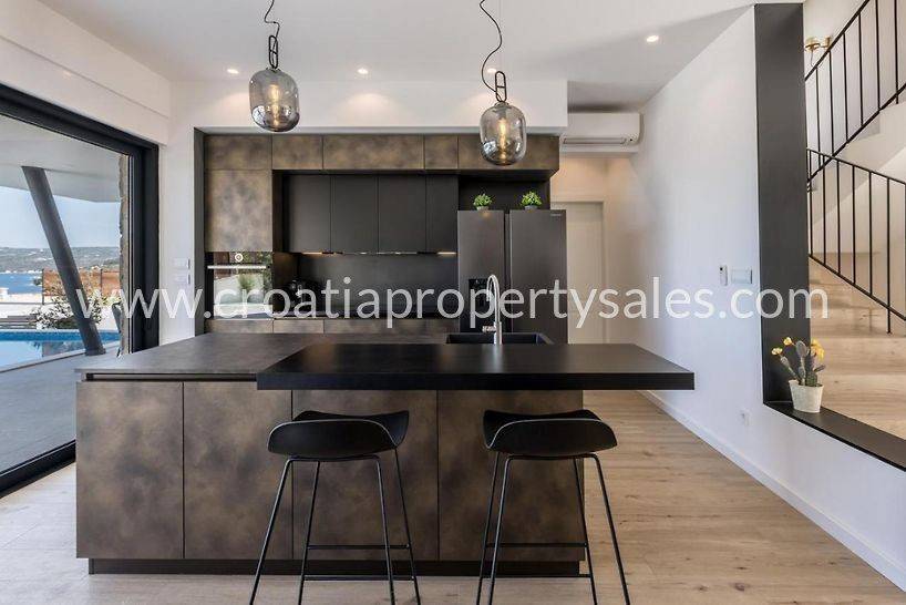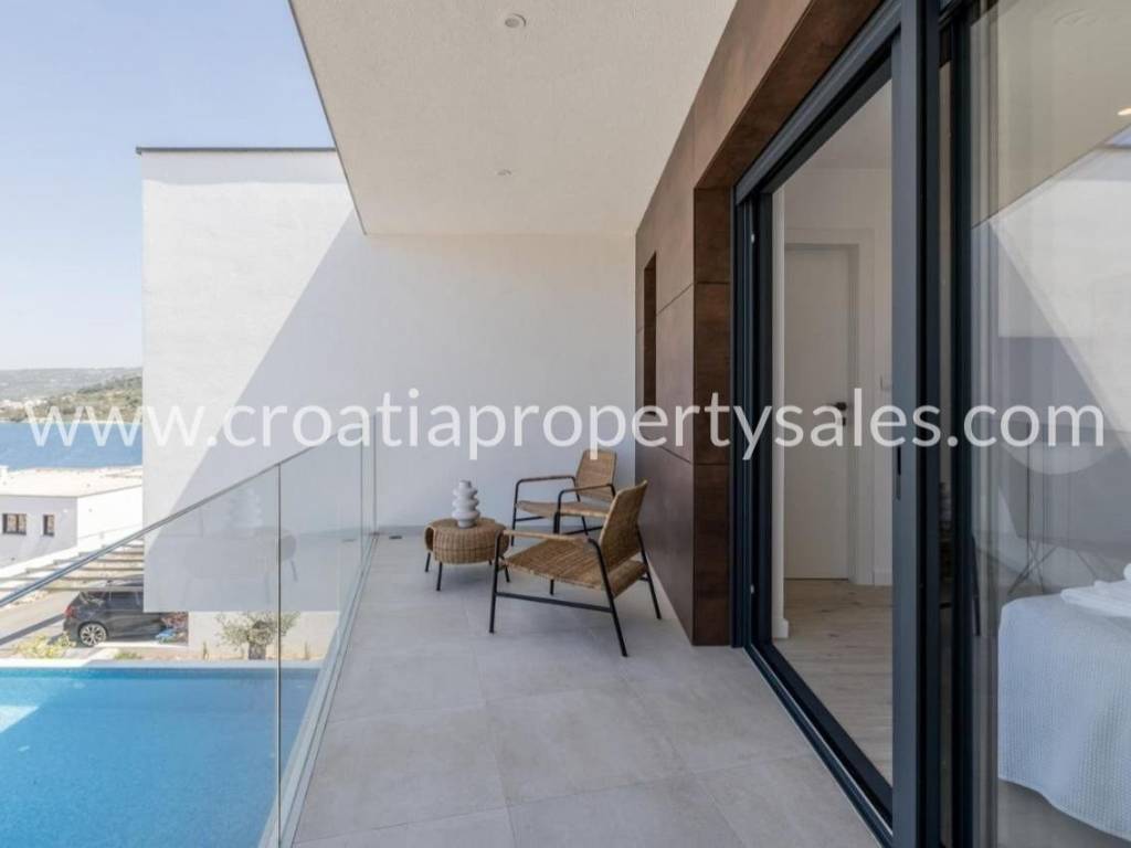Modern, luxuriously decorated villa in a beautiful bay not far from Rogoznica.The villa is built on a plot of 552 m2 and spreads over two floors.The first floor consists of a spacious living room with kitchen and dining room. From the living area there is an exit to a spacious terrace where it is possible to enjoy your time by the pool and barbecue grill.The second floor consists of three bedrooms with private bathrooms with large windows that allow a view of the sea and the environment.Carefully selected interior and exterior definitely classify this villa as a luxury property that is worth a look.