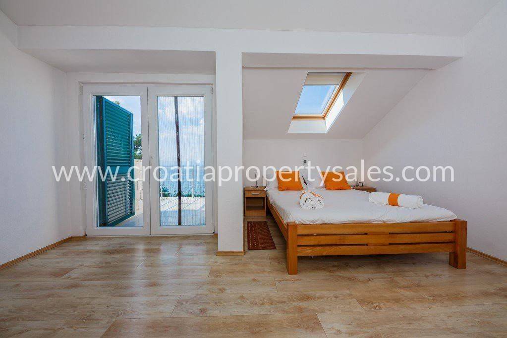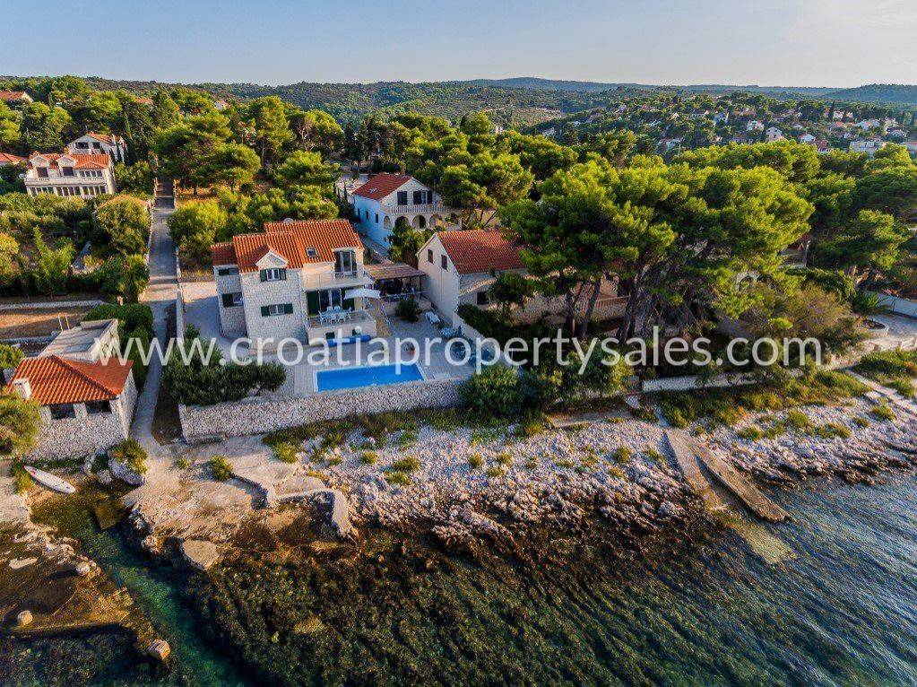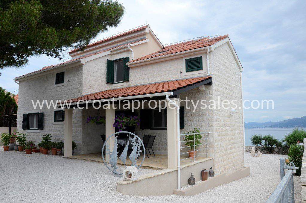 A unique property in a top location.A villa with a pool, first row to the sea in the true sense of the word, located in a small, charming quiet place where you forget all your problems and indulge in the charms of relaxation that this property offers.The entire house is 120 m2 and consists of a basement, ground floor and first floor.There are tools and pool equipment in the basement. Already from the parking lot or the approach to the house, you pass through the covered terrace and enter the ground floor, which consists of a spacious kitchen that is well equipped, a dining room, a living room that opens onto a terrace with a breathtaking view. There is also a bedroom with a double bed and a bathroom with a shower.We climb the internal stairs to the first floor where there are 3 bedrooms and 2 bathrooms, one spacious bathroom with a bathtub and the other with a shower cabin. One bedroom on the first floor has access to the balcony. Each room has air conditioning.On the first floor, only the bathrooms have underfloor heating, and the entire ground floor is completely underfloor heating.There is an outdoor shower right next to the pool. Parking for one car is covered.The barbecue grill is behind the house, which is also covered.In addition to the fact that this beautiful house is built completely in Brac stone, has a garden with a swimming pool and all the accompanying amenities, the first-line location by the sea puts it at the very top of unique real estate properties.
