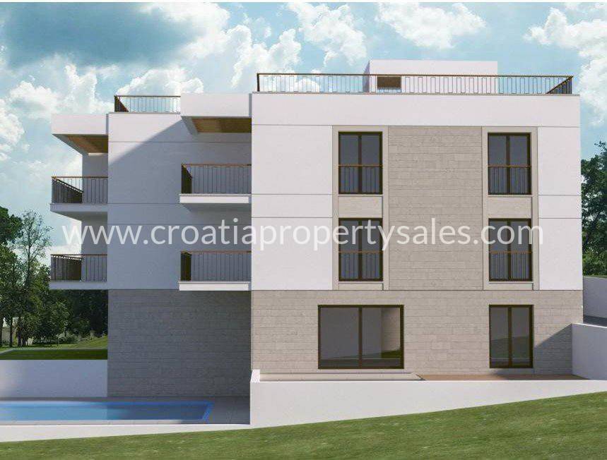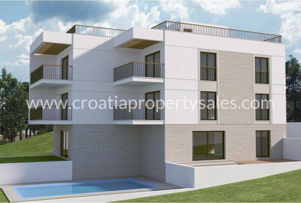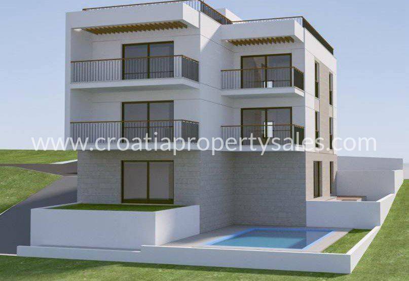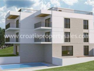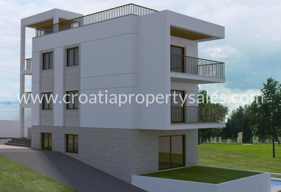 We have in our offer a new build, located on Ciovo island.A building with 6 apartments in total, ranging from 51 sqm to 60 sqm of living area.Apartments on the ground floor will have access to the terrace and its own garden, while the top floor apartments will have a private roof terrace. SECOND FLOOR: S5: 2 bedrooms, 1 bathroom, kitchen and living room area, storage and hallway – 59,78 sqm+ balcony of 12,86 sqm and a roof terrace of 73,4 sqm – 360.000 € S6: 2 bedrooms, 1 bathroom, kitchen and living room area, and hallway – 50,74 sqm + balcony of 9,80 sqm and a roof terrace of 61,6 sqm – 300.000 €All apartments will be sold unfurnished and ready to move in by summer of 2025. There will be an outdoor swimming pool for all tenants to use and each apartment will receive one outdoor parking space, which will be included in the price. In the first stages of construction, buyers will have the option of payment in installments. It’s a very nice location, close to the sea and all amenities.