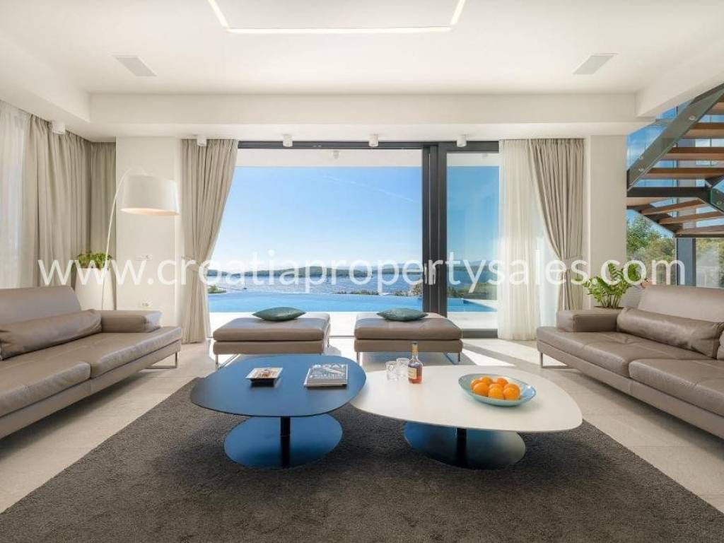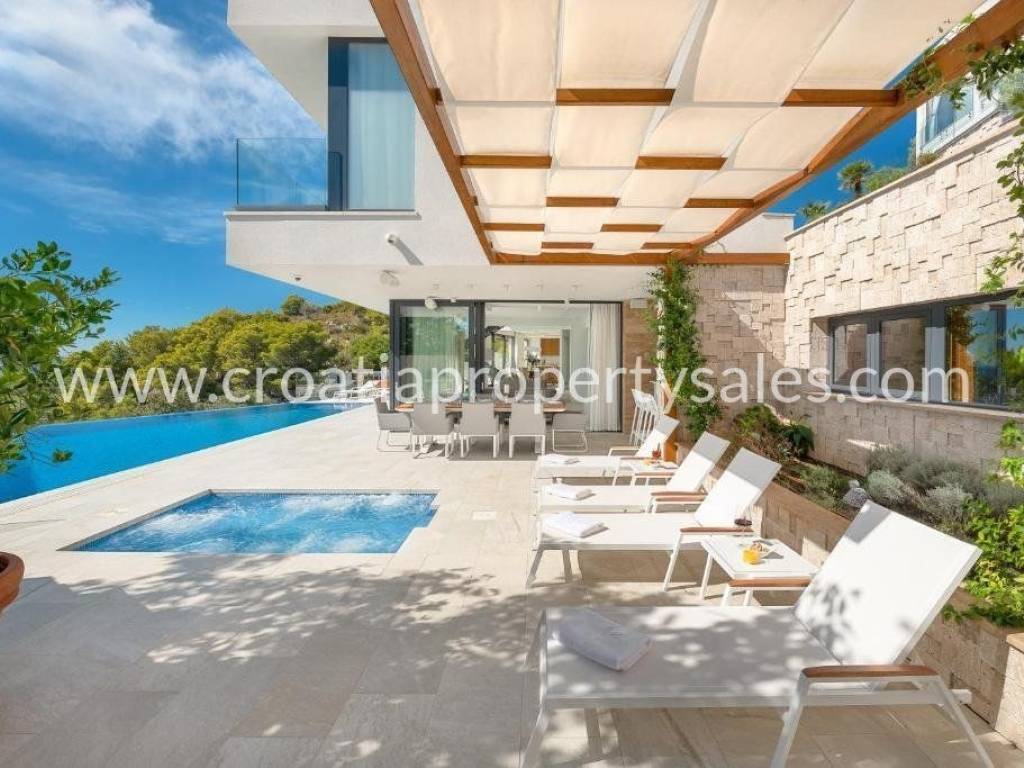 At a distance of 200 m from the sea, in one of the most attractive locations on the island of Hvar, there is this luxurious villa with an extraordinary view of the sea.The living area of the villa is 195m2 and it is located on a plot of land of 836m2.The villa has two floors, consisting of a living room and a kitchen that have excellent communication with the outside space, terrace and pool, it also has four bedrooms with bathrooms, a fitness room, a sauna and two extra bathrooms.In the outer part there is a dining room with an outdoor kitchen and fireplace, and a swimming pool of 58 m2.The property has four parking spaces.