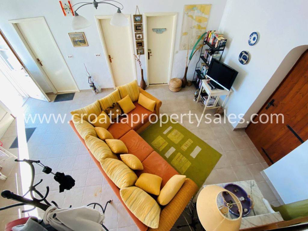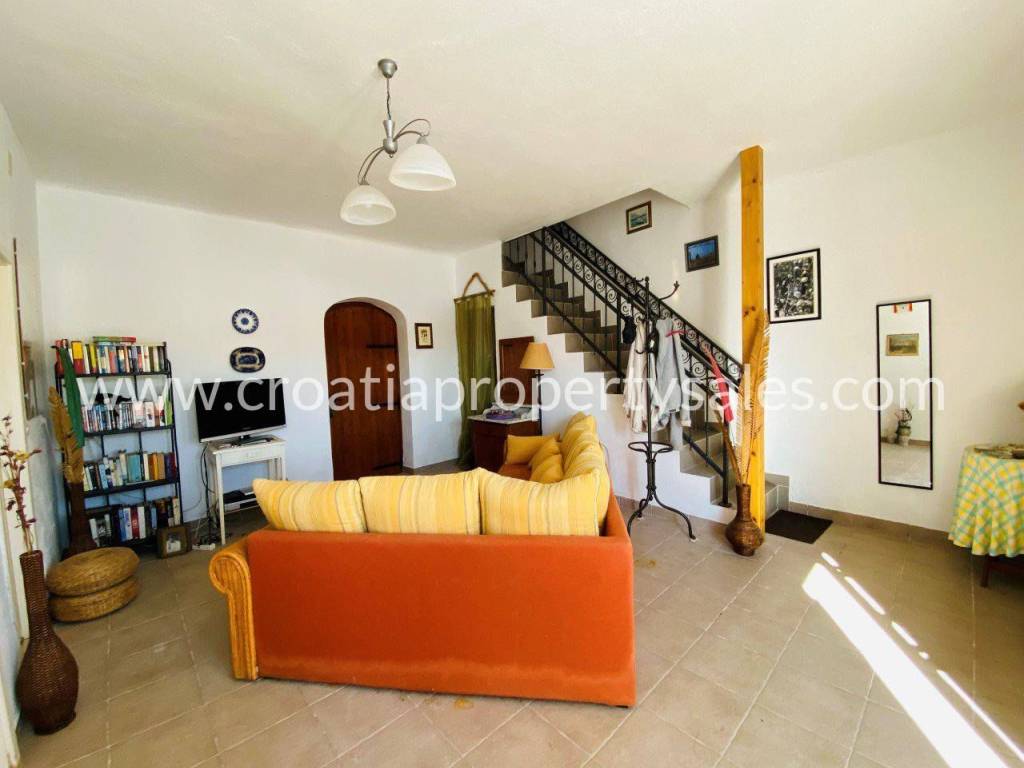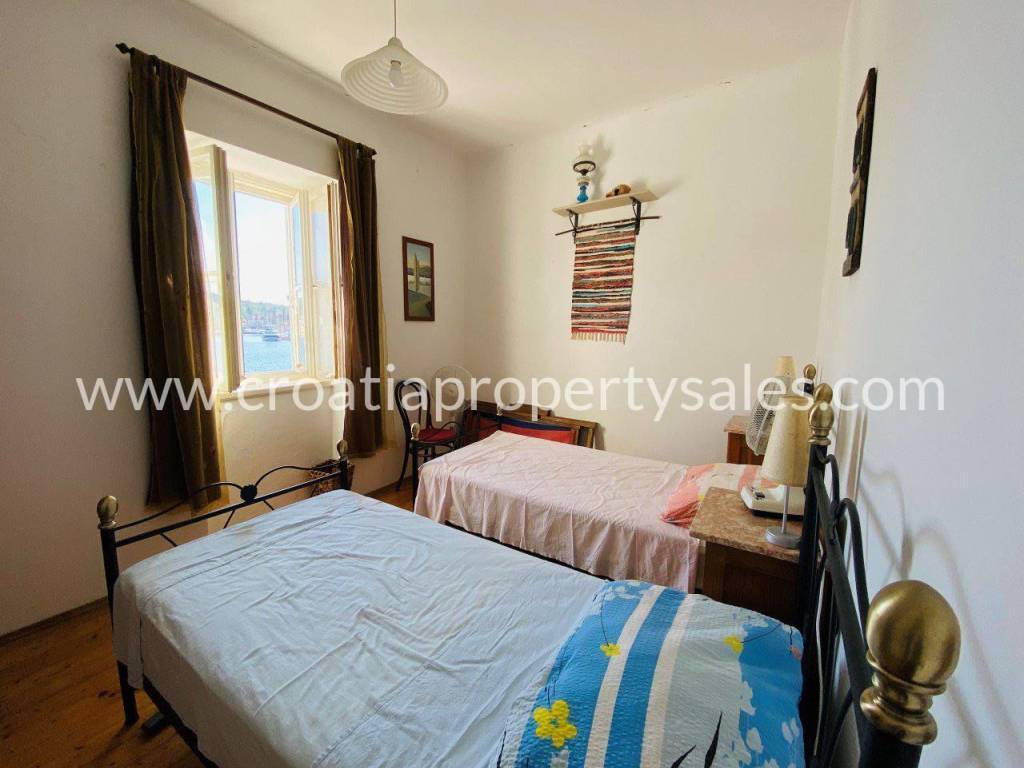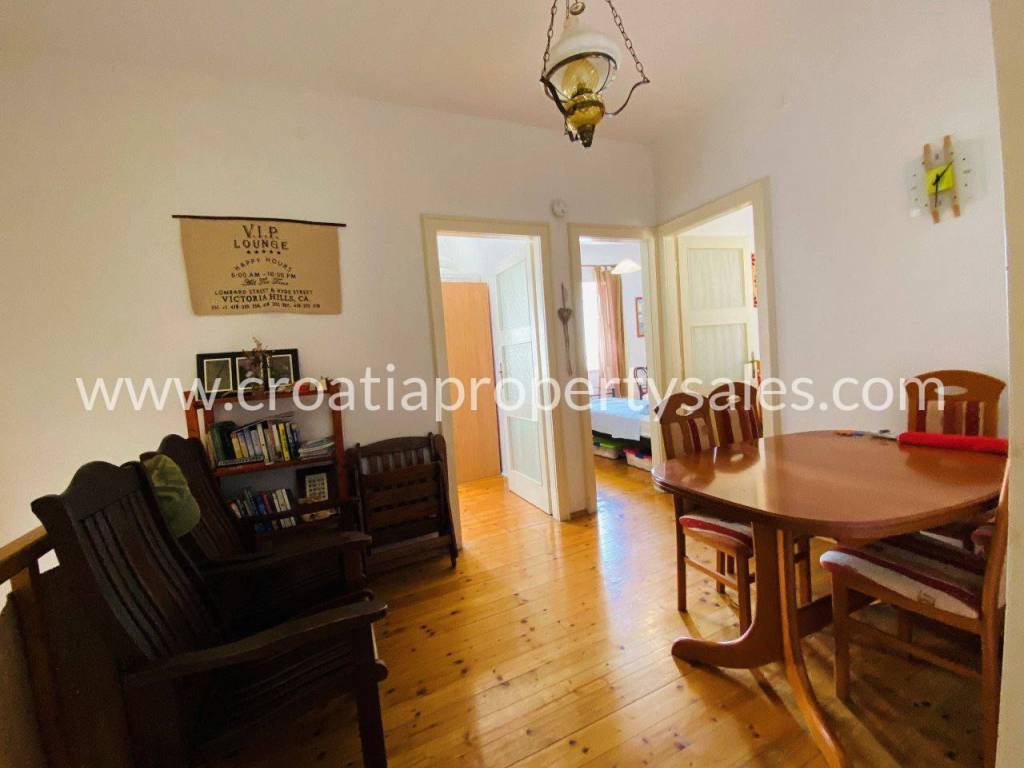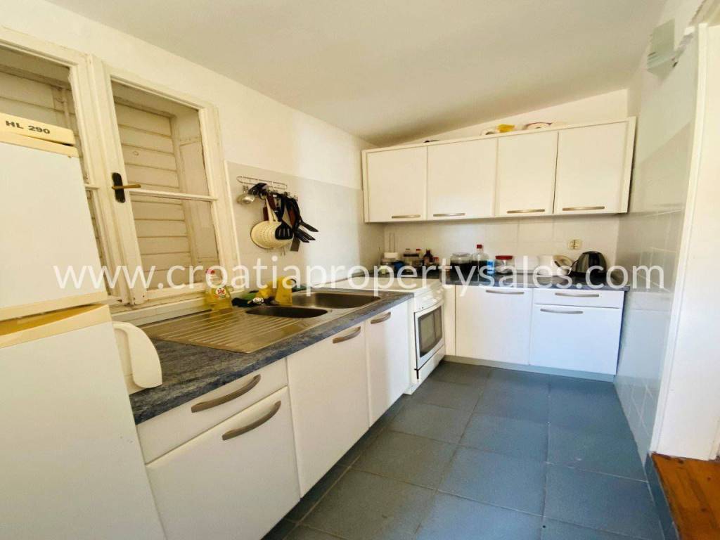 Semi-detached stone house in the first row to the sea.It consists of two floors and has a total of 116 m2.Upon entering the property, we immediately come into a large living room.There are three storage rooms and two bathrooms on the same floor.Internal stairs lead to the first floor where there are three bedrooms, a dining room and a kitchen. Two bedrooms offer a view of the waterfront and the sea.From the kitchen, the external stairs lead to a terrace of approx. 35 m2, from which there is a wonderful view of the sea, the promenade and the town.The house is air-conditioned, has a driveway, and all the infrastructure. Parking is available on the road nearby.