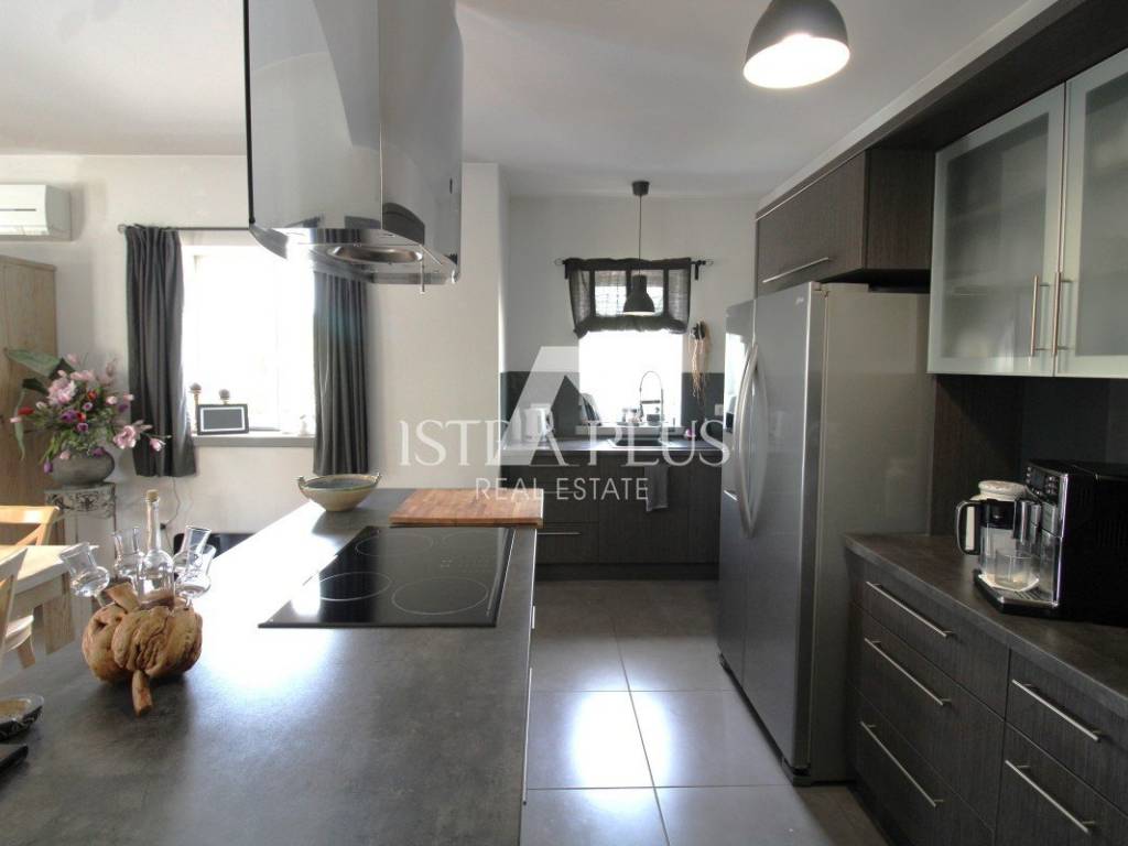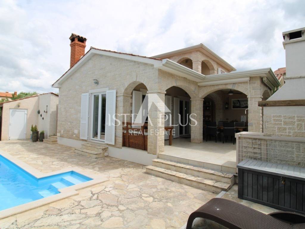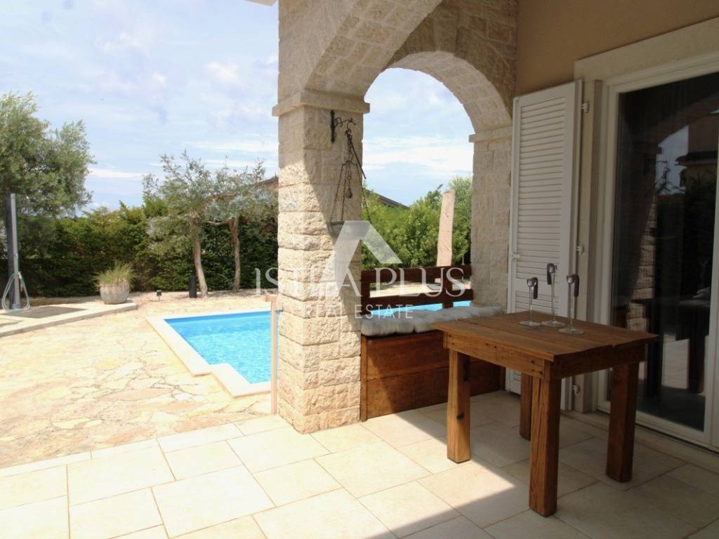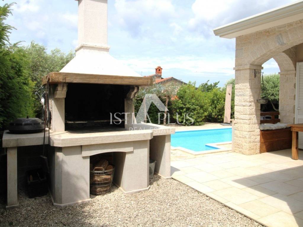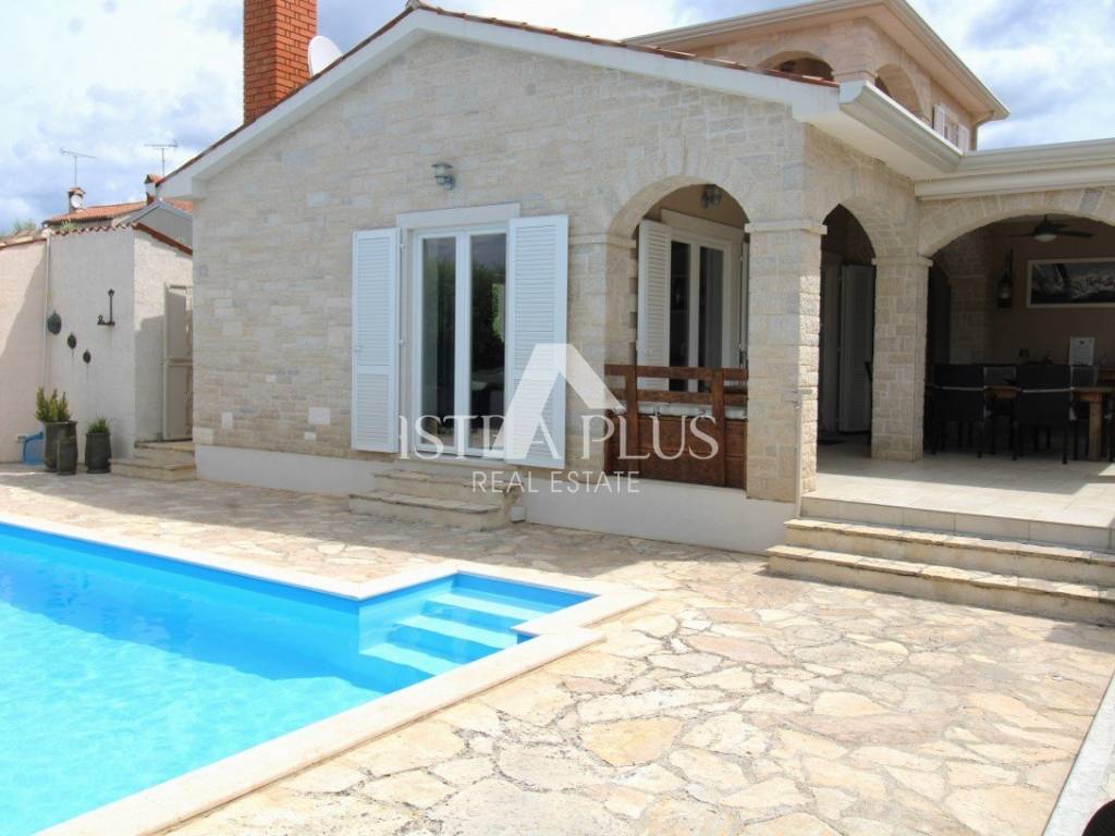 K84 Istria, zona di Parenzo, a 7 km dalla città e dal mare, è in vendita una casa indipendente con piscina di 23 m2. La casa ha 125m2 netti lordi 154,75m2, su terreno 589m2 Questa bella e spaziosa casa è composta da un ingresso, wc, due camere da letto e un bagno al piano terra. Cucina con dispensa e lavanderia, sala da pranzo e soggiorno con diverse uscite sulla terrazza coperta dove si trova anche una zona grill con camino e un cortile splendidamente decorato e curato con solarium e piscina. Al primo piano si trova una camera da letto con bagno privato e terrazzo con vista mare. Riscaldamento e raffrescamento tramite aria condizionata in tutte le stanze, stufa nel soggiorno. Nel cortile si trova anche una casetta da giardino con funzione di garage/deposito, e un oggetto dove si trovano le attrezzature della piscina e una legnaia. viene venduto arredato e corredato. 4 parcheggi Proprietà bellissima e di altissima qualità in un'ottima posizione in un ambiente tranquillo!