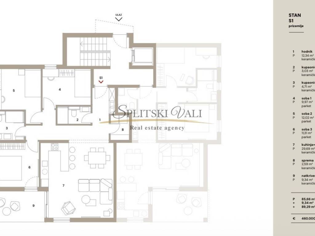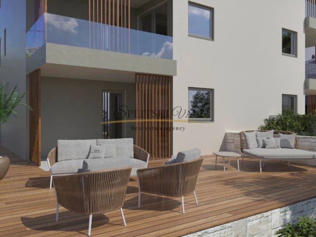 Posredujemo u prodaji odličnog stana u izgradnji obračunski ukupne površine 99,23m2 koji se nalazi u prizemlju novogradnje u Solinu, u neposrednoj blizini centra. Sastoji se od hodnika, kuhinje s blagovaonicom i dnevnog boravka, 3 spavaće sobe, 2 kupaonice, spremišta te natkrivene terase. Stanu pripada garažno parking mjesto kao i prostran vrt. Postoji mogućnost postavljanja podnog grijanja u dnevnom boravku te kupnje dodatnog garažnog parking mjesta. Iz garaže se može liftom doći do stana. Planiran završetak gradnje je krajem 2026. godine. Kupac plaća posredničku naknadu. Za više informacija molimo Vas nazovite na broj 0915002178 - Ana ili 0953355426 - Neda. Razgled nekretnine moguć je isključivo uz potpisani Ugovor o posredovanju, a što je u skladu sa Zakonom o zaštiti podataka i Zakonom o posredovanju i prometu nekretninama.