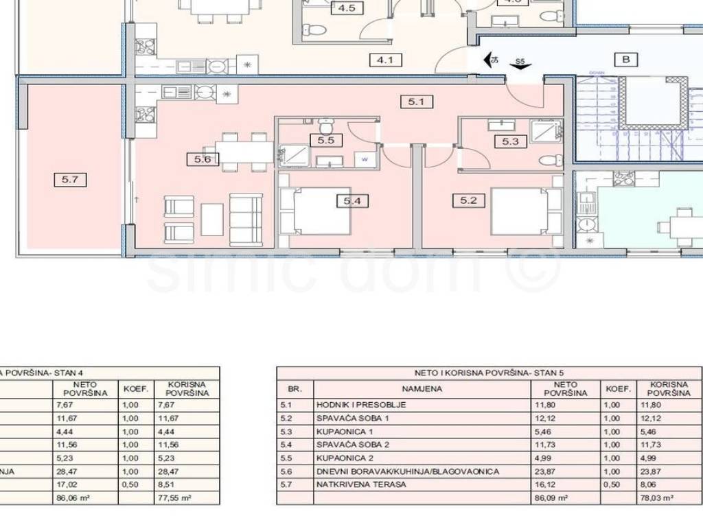 We are mediating the sale of apartments in a new building in one of the best locations in Srima. The new building is located a few steps from the beach and 700 m from the center. Since the building is being built by a company, buyers are exempt from real estate tax. The residential unit "S6" is placed on the first floor of the building and has a net area including accessories of 78 m, or 86 m of floor area. It consists of an entrance hall, two bedrooms, one of which has its own bathroom, additional bathrooms, a kitchen with a dining room and a living room with access to a covered terrace with a sea view. The apartment has one outdoor parking space. All apartments will be equipped with a polystyrene facade, security doors, high-quality PVC joinery, electric shutters, mosquito nets, air conditioning in all rooms, high-quality floor coverings, modern bathroom fixtures, underfloor heating in the bathrooms and glass railings on the terraces. Considering the excellent location, only 70m from the beach, which is reached by a public footpath, as well as the proximity of other facilities, this apartment is a great investment. The expected occupancy is the end of 2026.