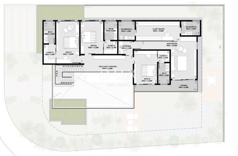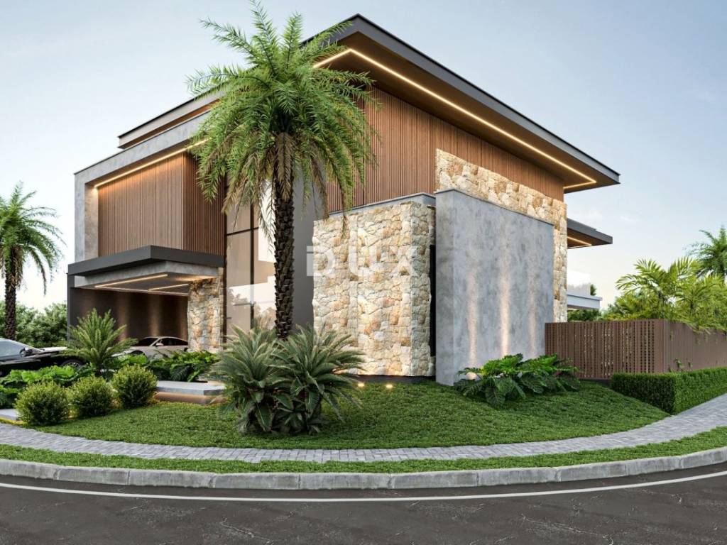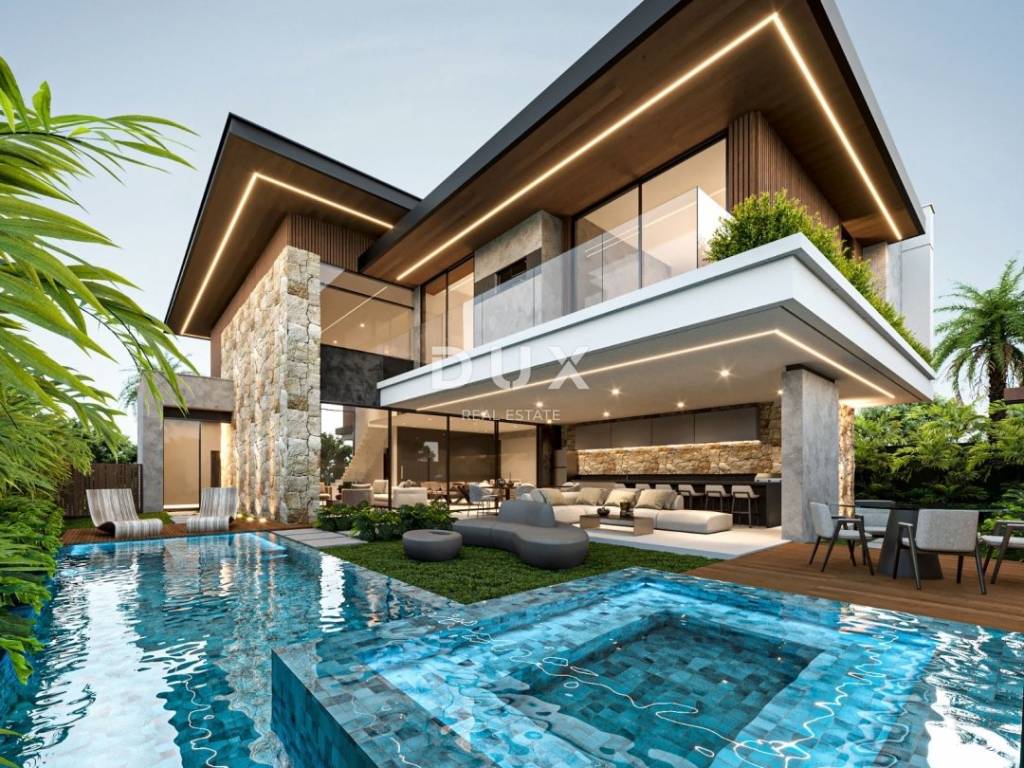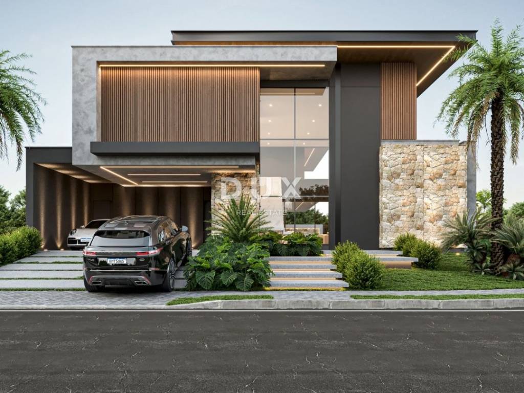 Projekt je izrađen za modernu vilu koja u prizemlju ima ulazni prostor, kuhinju s blagovaonicom i dnevnim boravkom, spremište, terasu, dva WC-a, jednu spavaću sobu s vlastitom kupaonicom, dodatnu terasu te natkriveni parking. U dvorištu je predviđen vanjski bazen dimenzija 10 x 7 metara i dubine 1,5 m. Na katu se nalaze četiri spavaće sobe, svaka s vlastitom kupaonicom i garderobom.