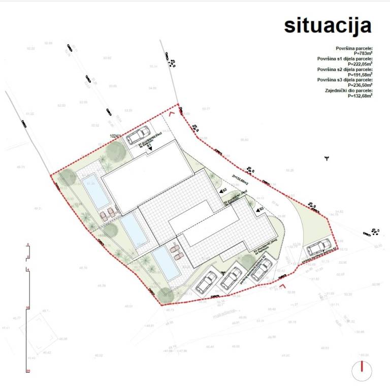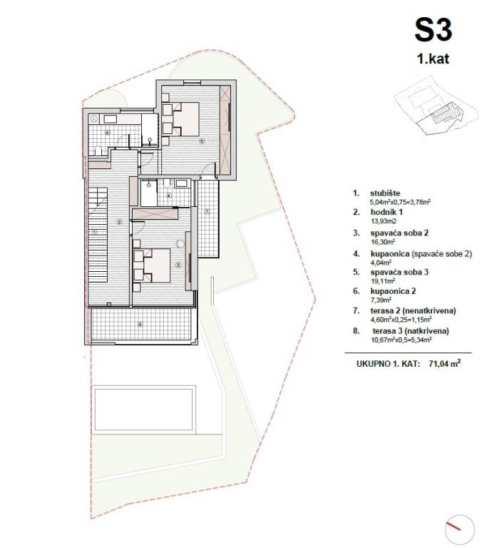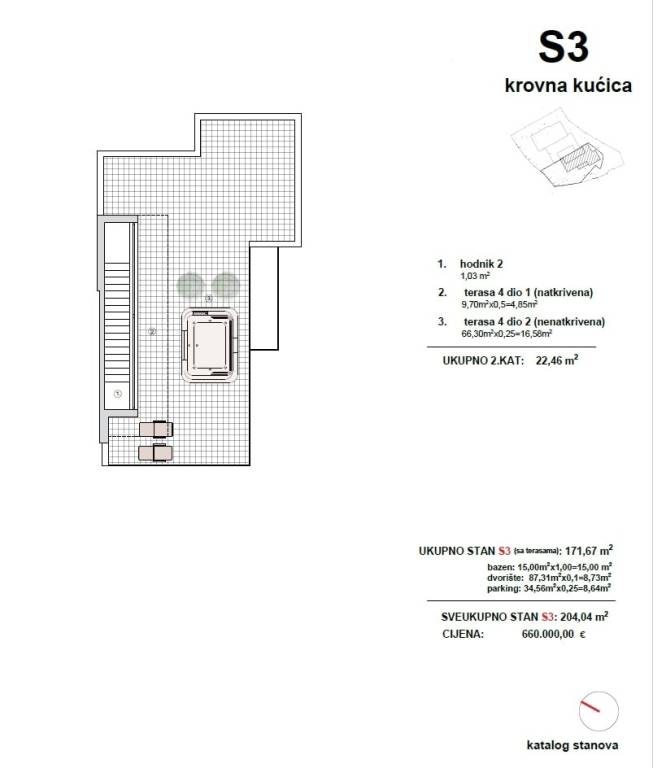 Casa S3 con superficie netta utile totale di 204,04 m2 si compone di tre piani: piano terra, primo piano e terrazza sul tetto con casetta sul tetto. Il piano terra con superficie netta di 78,17 m2 è composto da ingresso, vano d’ingresso, ripostiglio, bagno, camera da letto, cucina con zona pranzo e soggiorno open space con uscita su terrazza coperta di 12,14 m2 a cui segue piscina di 15 m2 e giardino. Tramite scala interna si accede al primo piano che comprende corridoio, bagno, camera da letto con uscita su terrazza scoperta di 4,60 m2, e camera matrimoniale con bagno e uscita su terrazza coperta di 10,67 m2. Tramite scala interna si accede al secondo piano che è composto da corridoio, terrazza coperta di 9,70 m2 e terrazza scoperta di 66,30 m2. Alla casa appartengono giardino/cortile di 87,31 m2 e posto auto di 34,56 m2. PREZZO: 660.000,00 €